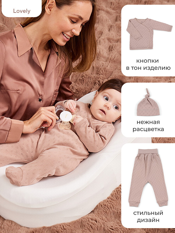 Коллекция LOVELY подарит крохе ощущение нежности и особой заботы. Мягкие сдержанные расцветки (молоко, какао, топленое масло), деликатные натуральные ткани премиум-класса (перфорированный трикотаж и утепленный капитоний), качественная фурнитура в тон, комфортное лекало, лаконичное исполнение, сочетающиеся между собой изделия - визитная карточка нашей одежды для новорожденных и малышей постарше.