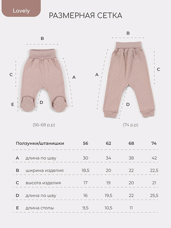 Обращаем ваше внимание: размеры 56 и 62 идут с антицарапками и швами наружу; размеры 56, 62, 68 выполнены с закрытой ножкой.