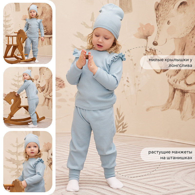 Трогательный комплект для прогулок, путешествий и запоминающихся фотосессий. Штанишки дополнены мягким поясом и широкими трикотажными манжетами. Застежка-поло на 3 пуговицы сделает процесс переодевания лонгслива максимально комфортным, а для маленьких модниц предлагается модель с очаровательными крылышками. В подарок стильная шапочка. Аксессуар не только отлично защитит ушки от ветра, но завершит модный аутфит.
