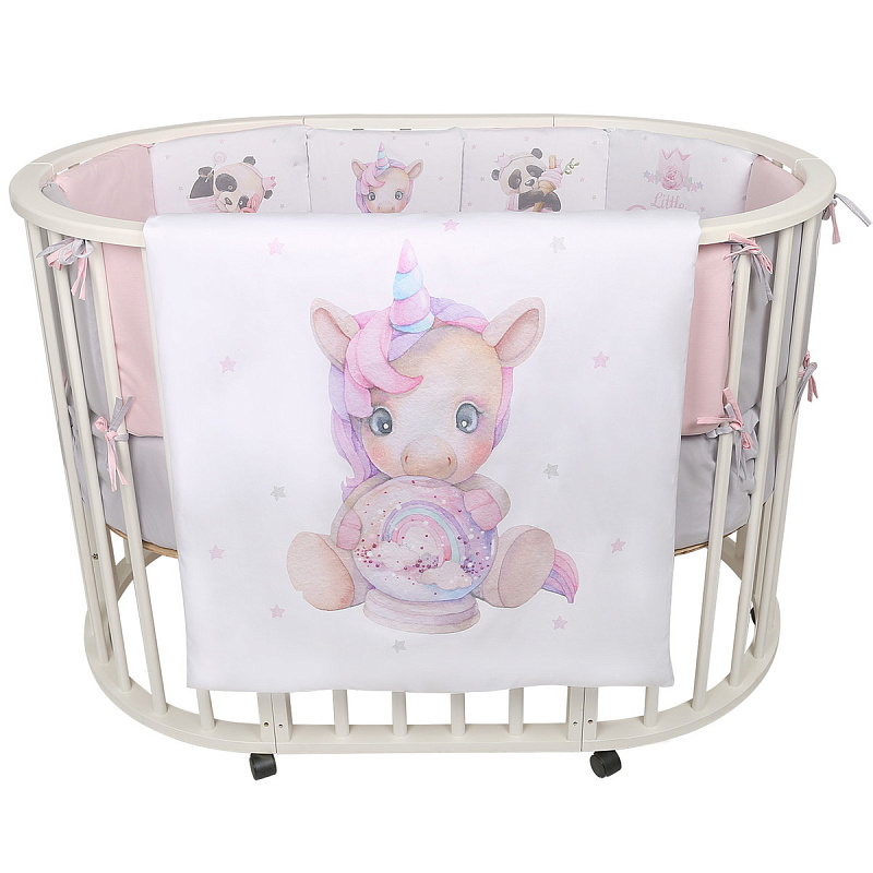 Комплект в кроватку подходит как в кругло-овальную, так и в классическую детскую кроватку. Одеяло удобно использовать и для прогулок в коляске, брать с собой в гости или в поликлинику.