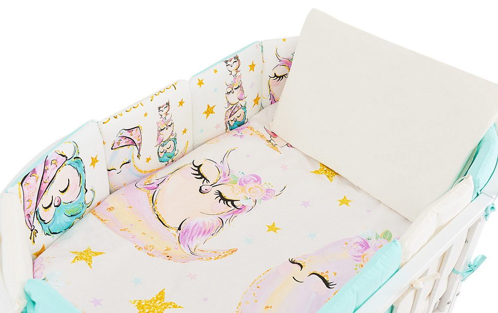 В этом ансамбле вы найдете все необходимое для сладких снов: пододеяльник, словно облако, укутает теплом, простыня, нежная как лепесток розы, наволочка, где будут рождаться самые светлые сновидения, одеяло и подушка, созданные для безмятежного отдыха, и, конечно же, бортики-подушечки – мягкая защита от внешнего мира, оберегающая сон малыша.
