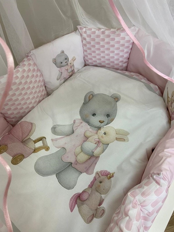 Красивый комплект в детскую кроватку изготовлен из качественной и натуральной ткани. Украшен милыми и забавными рисунками.