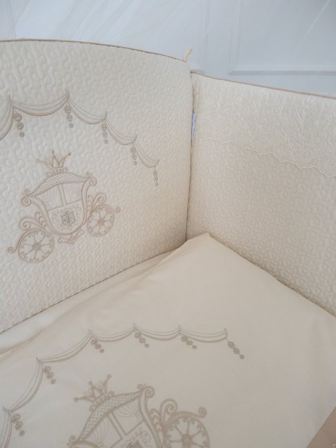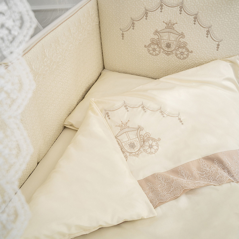 Комплект 6 предметов «Карета» арт.6113 для прямоугольной кроватки, выполнен из высококачественного сатина европейского качества (международный сертификат качества OEKO-TEX Standart 100). Нежность и благородство сатинового полотна, роскошь кружева, стеганые борта с тонким кантом в тон комплекта и изысканность вышивки, все это отличает данную коллекцию. Она создана для тех, кого мы с большой любовью называем "нашими маленькими принцессами". Все это для того, чтобы они смогли почувствовать атмосферу волшебства и праздника