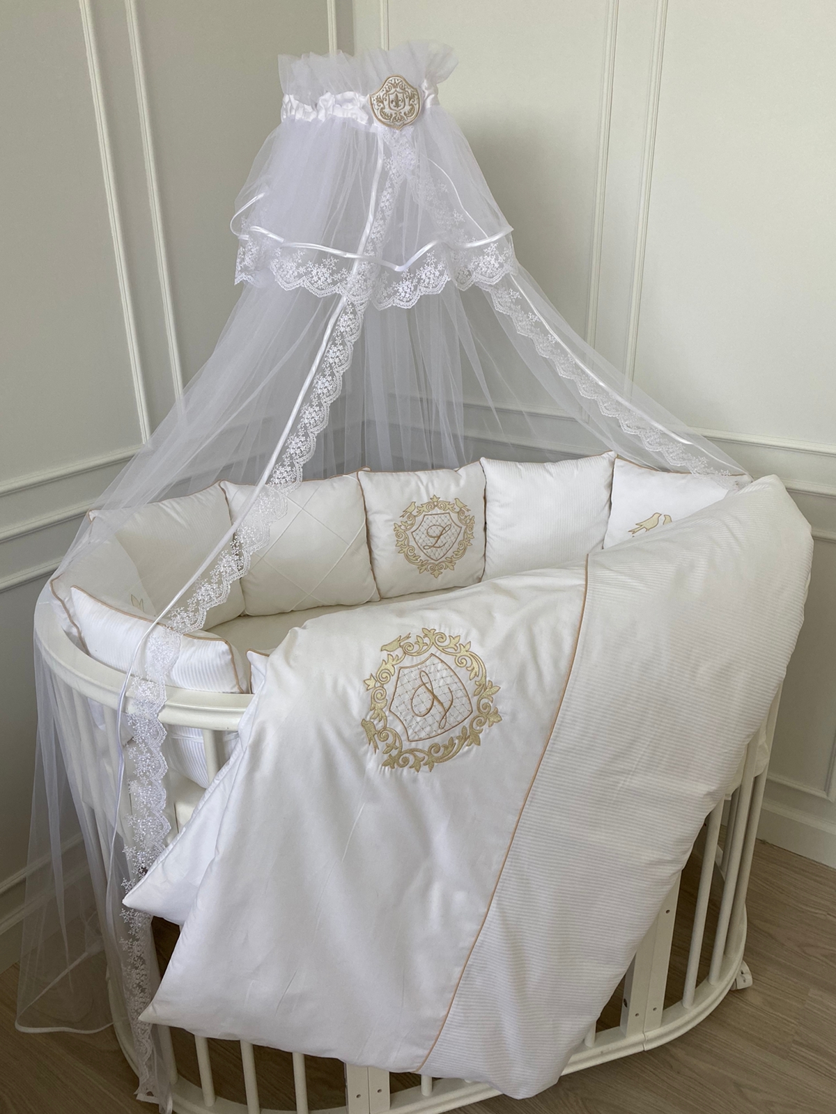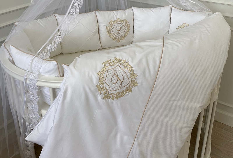 Универсальный комплект «Лаппетти» арт.6122 для круглой (овальной) и прямоугольной кроватки, сделан с использованием тканей высокого качества поплина и сатина. Одеяло и подушечки украшены эксклюзивным дизайном. Данный комплект подходит, как для мальчика, так и для девочки.Так как мы рекомендуем данный комплект для овальной и прямоугольной кроватки, такой вид и размер простыни делают ее подходящей на любой матраса.
