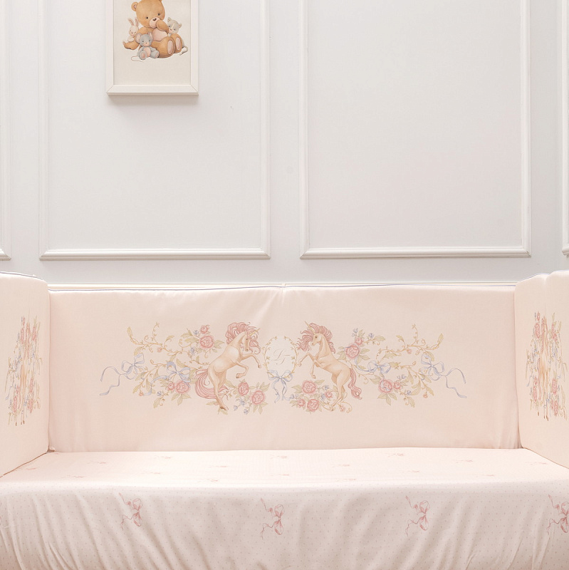 Бортики стеганые двухсторонние (4 части, 360*44 см): Обеспечивают защиту от ударов о стенки кроватки, создают ощущение уюта и тепла.