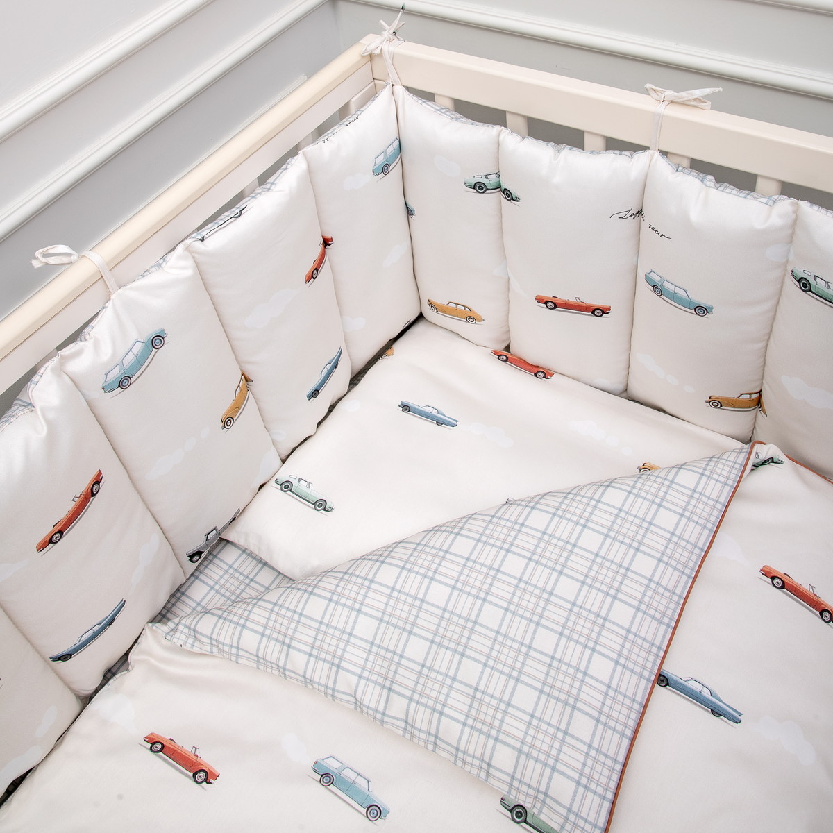 Комплект в кроватку Lappetti Маленький гонщик уни-ый, стеганные борта, премиальный сатин 6155 6 пр. серо-голубой