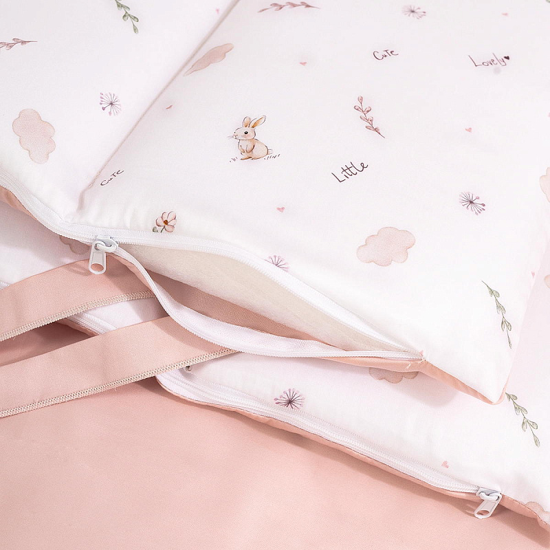 Комплект включает 6 предметов: пододеяльник на молнии, наволочку, простыню на резинке, одеяло, подушку и защитные бортики.