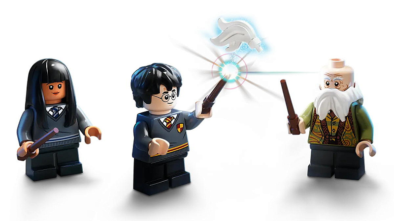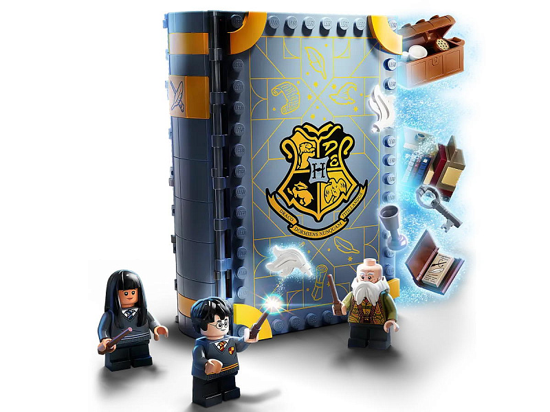 Включает минифигурки Гарри Поттера, Чо Чанга и профессора Флитвика, доску, книжную полку, камин, книгу заклинаний и множество оригинальных аксессуаров.