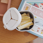 Контейнер имеет мягкое отверстие в виде трех лепестков, через которое удобно доставать перекус, не рассыпая содержимое.