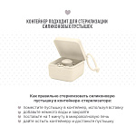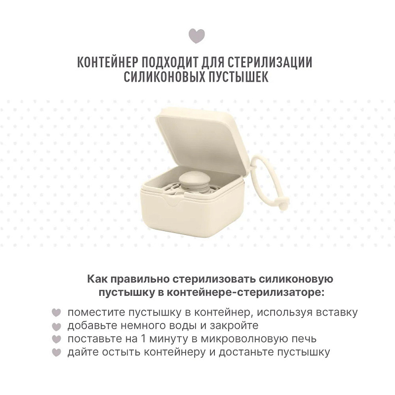 *Для стерилизации силиконовых пустышек необходимо добавить 2 столовых ложки холодной воды в контейнер и поставить его в микроволновую печь на 60 секунд при максимальной мощности 600 Вт. Температура не должна достигать 100°С. После стерилизации нужно дать остыть контейнеру пару минут, и пустышка снова готова к использованию.