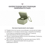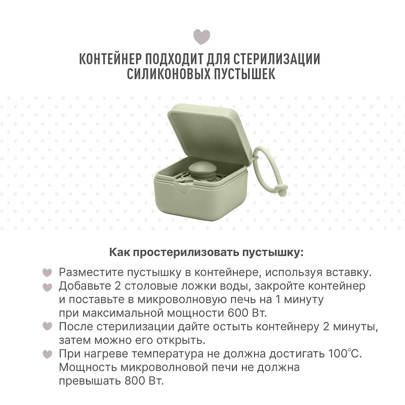 *Для стерилизации силиконовых пустышек необходимо добавить 2 столовых ложки холодной воды в контейнер и поставить его в микроволновую печь на 60 секунд при максимальной мощности 600 Вт. Температура не должна достигать 100°С. После стерилизации нужно дать остыть контейнеру пару минут, и пустышка снова готова к использованию.