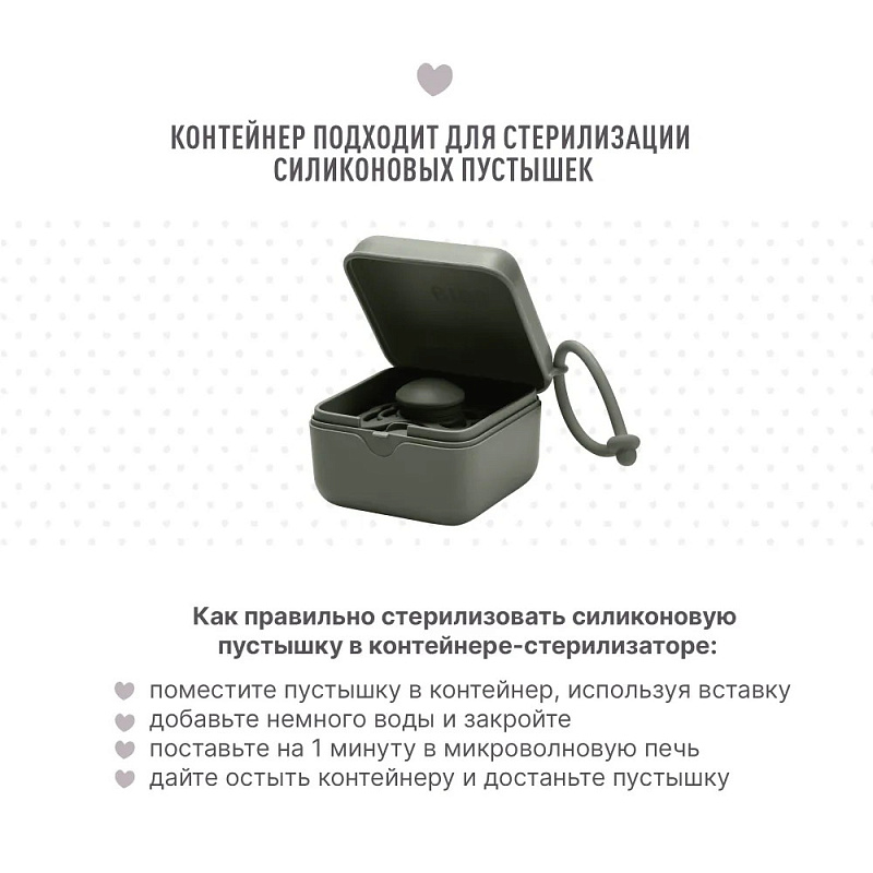 *Для стерилизации силиконовых пустышек необходимо добавить 2 столовых ложки холодной воды в контейнер и поставить его в микроволновую печь на 60 секунд при максимальной мощности 600 Вт. Температура не должна достигать 100°С. После стерилизации нужно дать остыть контейнеру пару минут, и пустышка снова готова к использованию.