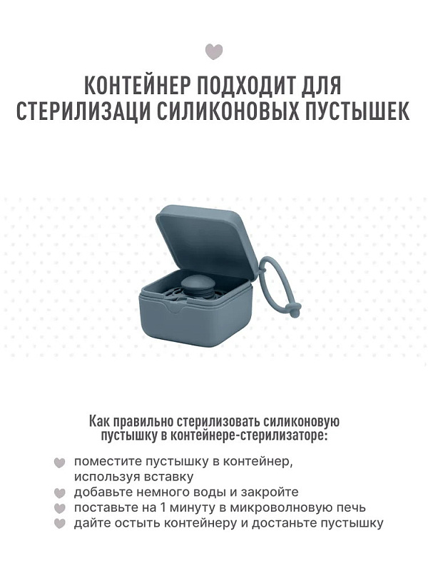 *Для стерилизации силиконовых пустышек необходимо добавить 2 столовых ложки холодной воды в контейнер и поставить его в микроволновую печь на 60 секунд при максимальной мощности 600 Вт. Температура не должна достигать 100°С. После стерилизации нужно дать остыть контейнеру пару минут, и пустышка снова готова к использованию.