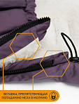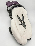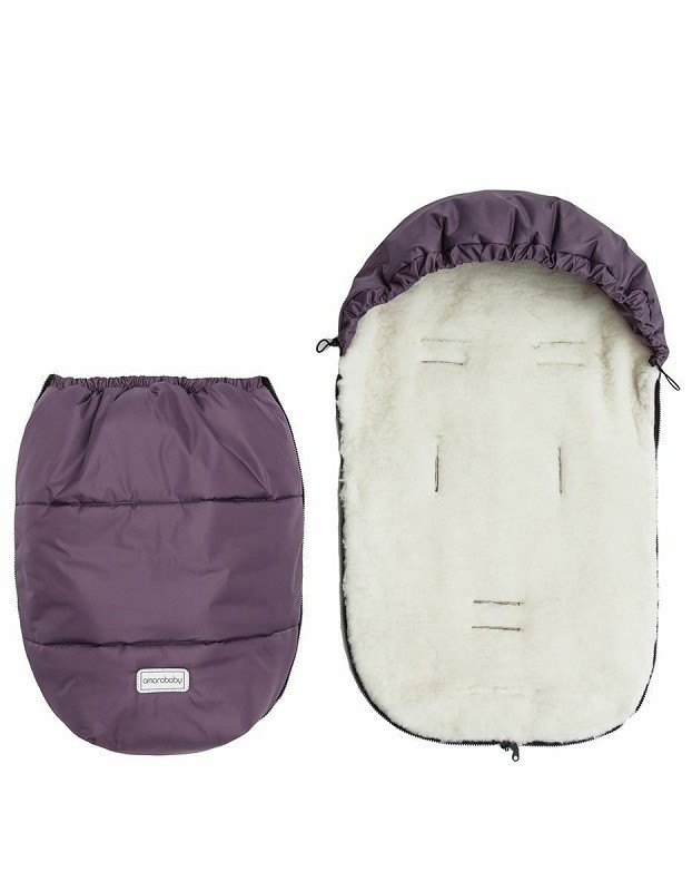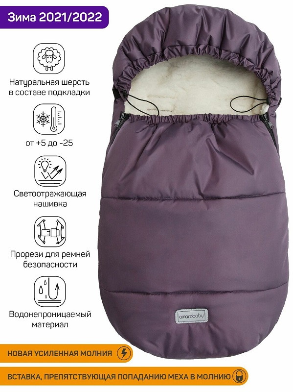 Конверт рассчитан на холода до -25 °С и состоит из трех защитных слоев: непромокаемого верха, плотного утеплителя и подкладки из меха с натуральной шерстью.