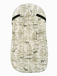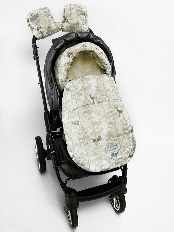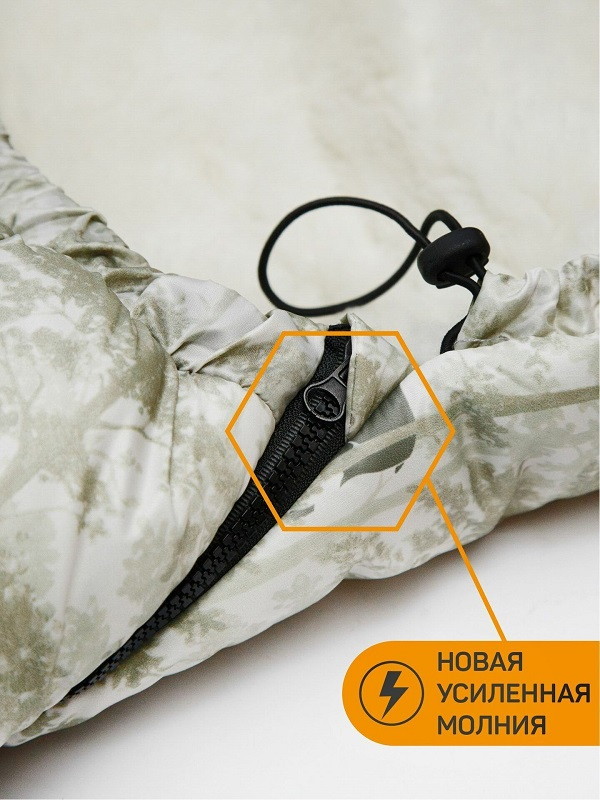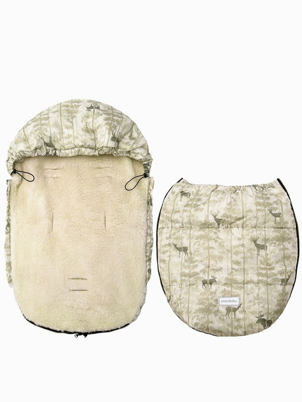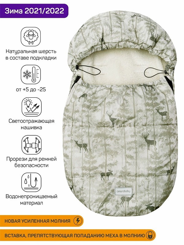 Конверт рассчитан на холода до -25 °С и состоит из трех защитных слоев: непромокаемого верха, плотного утеплителя и подкладки из меха с натуральной шерстью.