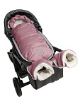 Конверт рассчитан на холода до -25 °С и состоит из трех защитных слоев: непромокаемого верха, плотного утеплителя и подкладки из меха с натуральной шерстью.
