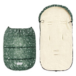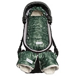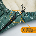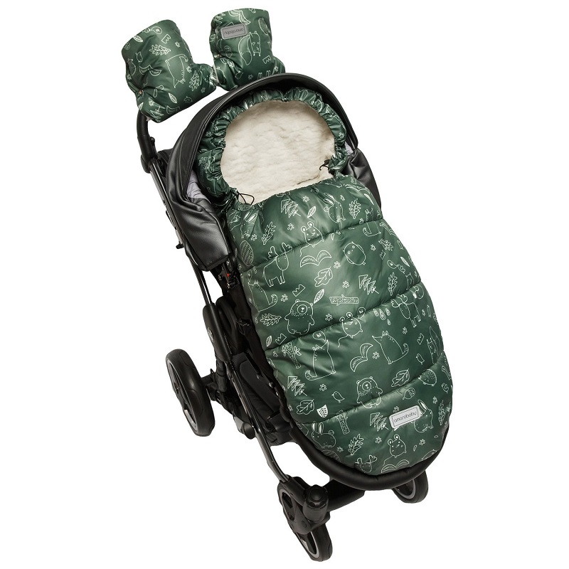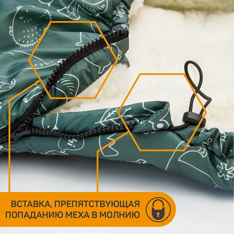 Конверт рассчитан на холода до -25 °С и состоит из трех защитных слоев: непромокаемого верха, плотного утеплителя и подкладки из меха с натуральной шерстью.