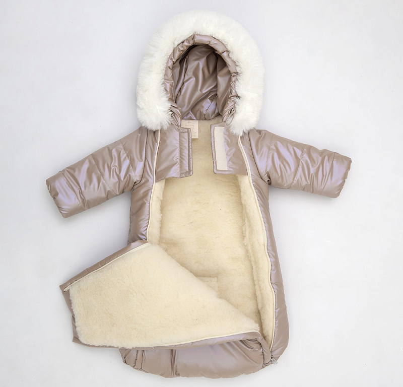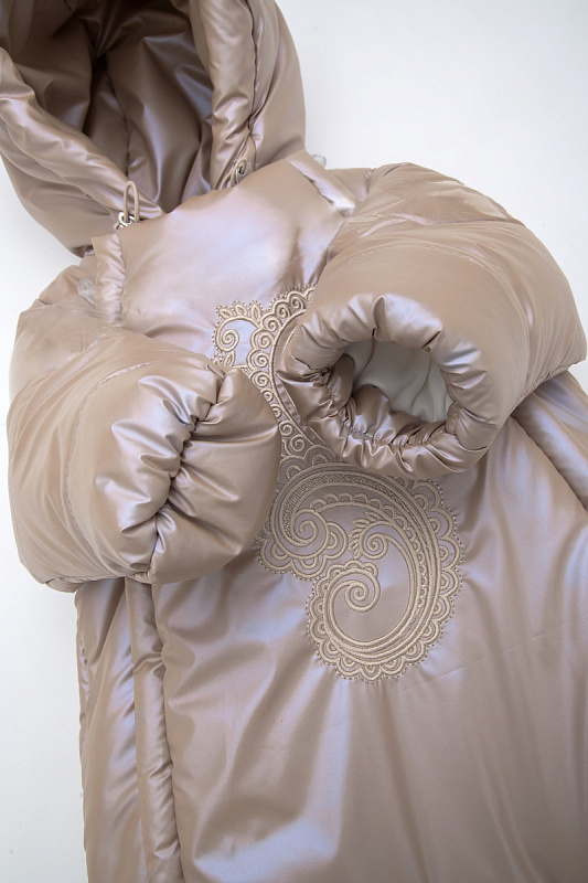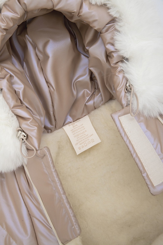 "Церемония", изготовлен из курточной ткани с перламутровым блеском по инновационной технологии FITSYSTEM tm, что дает гарантию долгого срока службы и идеальной защиты от ветра и влаги. Это идеальный конверт для зимних прогулок.