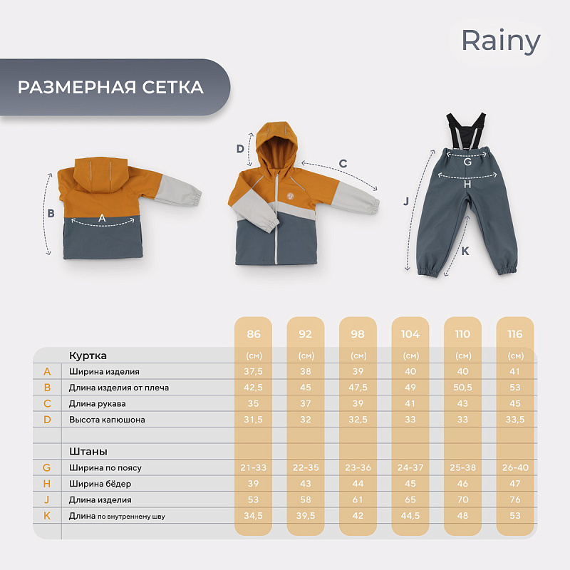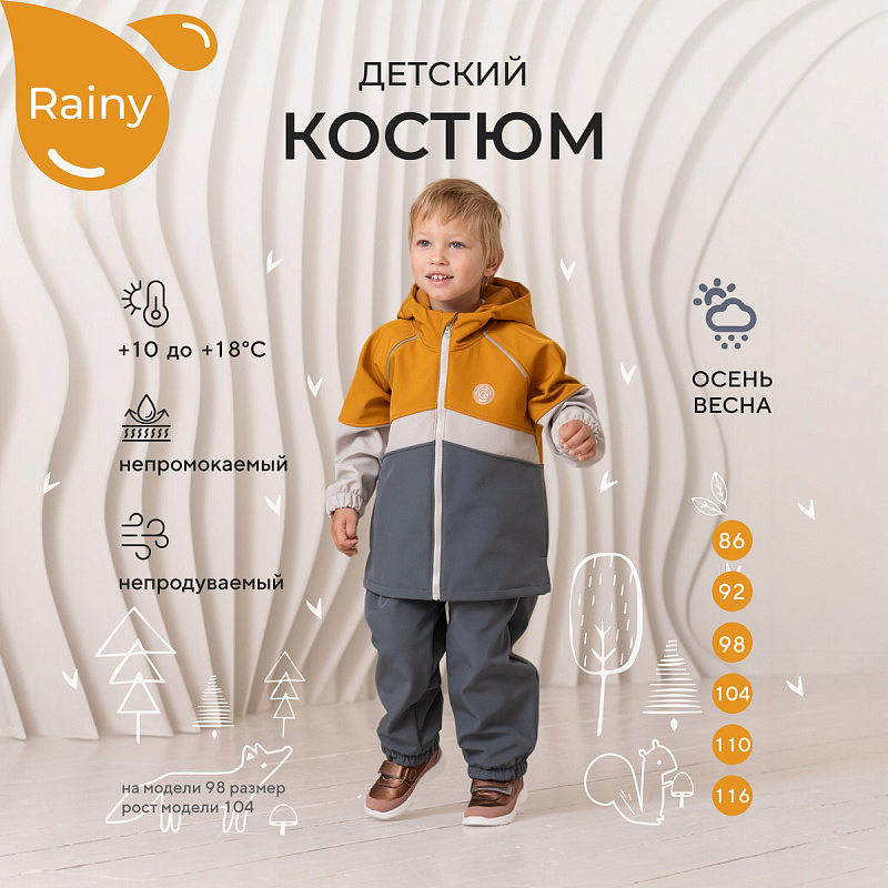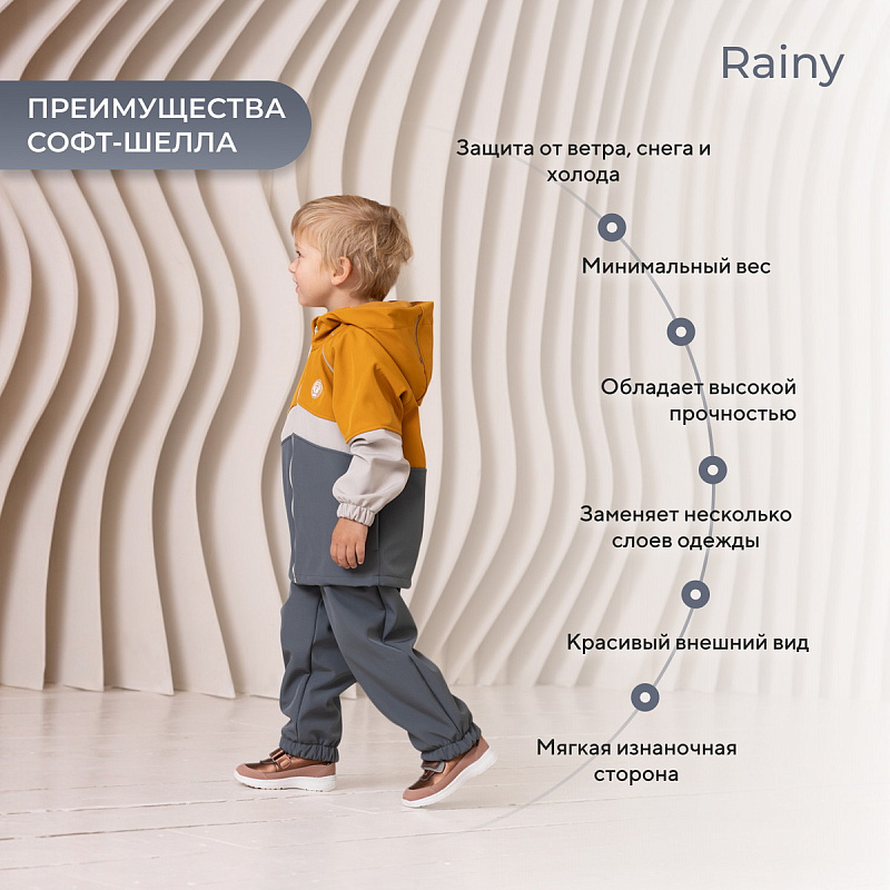 Какое детство без прогулок по лужам? Детский демисезонный костюм RANT RAINY подарит малышу невероятное ощущение уюта и тепла. Модель покорит вас: инновационным влагоотталкивающим и ветронепроницаемым материалом софтшелл, тщательно продуманными деталями кроя, лаконичным исполнением, комфортным лекалом.
