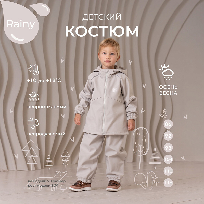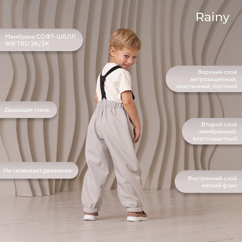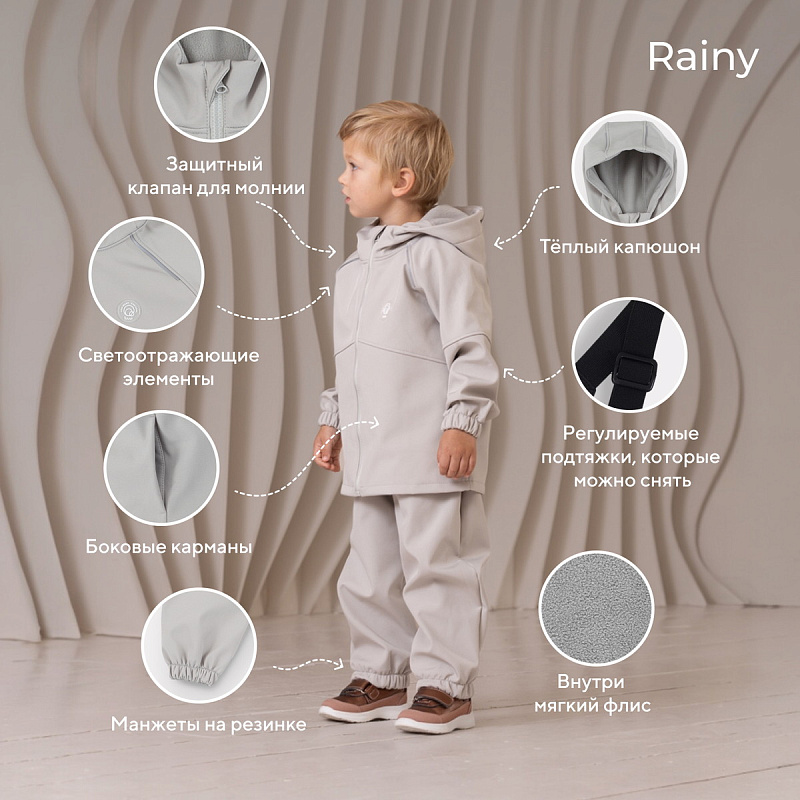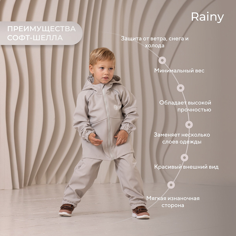 Какое детство без прогулок по лужам? Детский демисезонный костюм RANT RAINY подарит малышу невероятное ощущение уюта и тепла. Модель покорит вас: инновационным влагоотталкивающим и ветронепроницаемым материалом софтшелл, тщательно продуманными деталями кроя, лаконичным исполнением, комфортным лекалом.