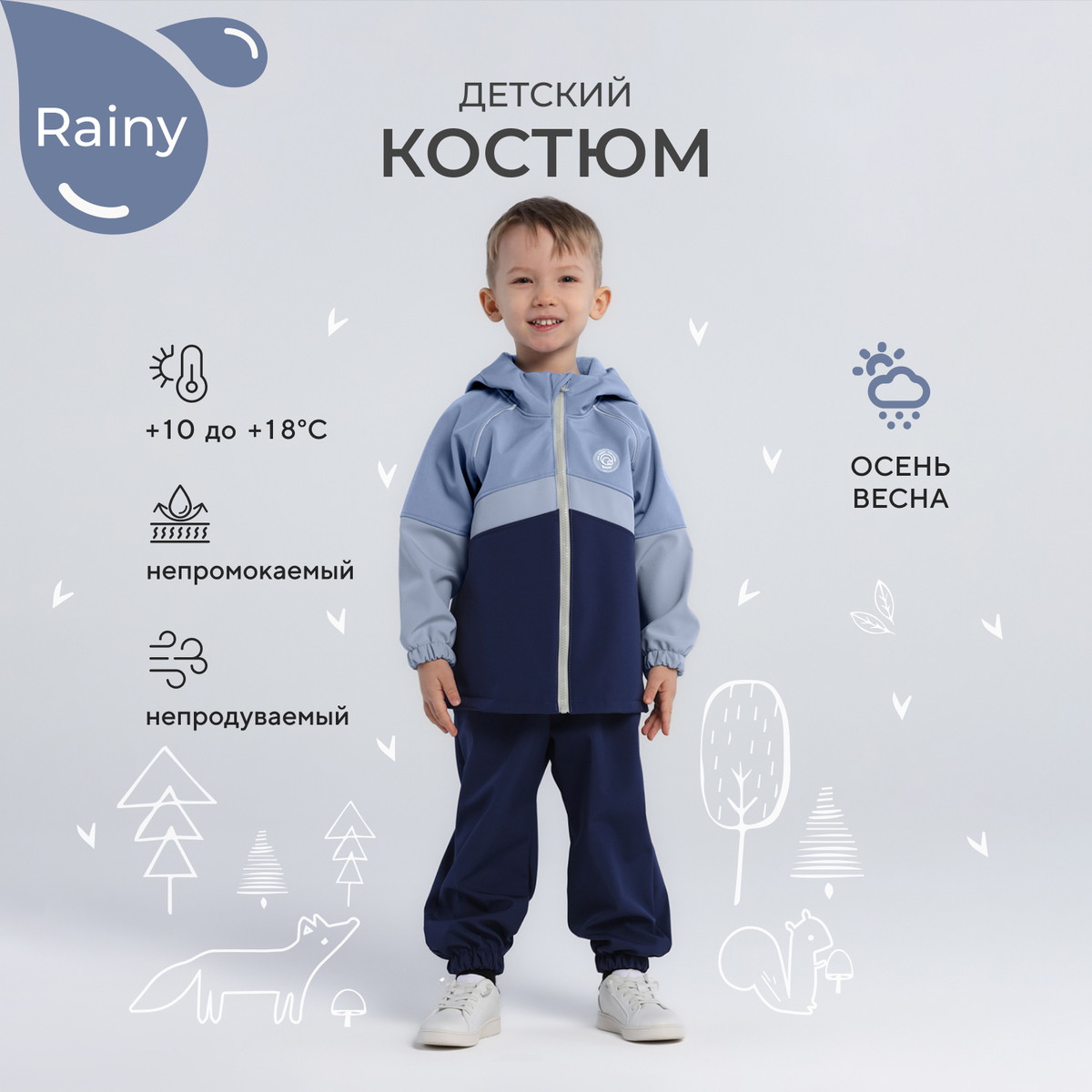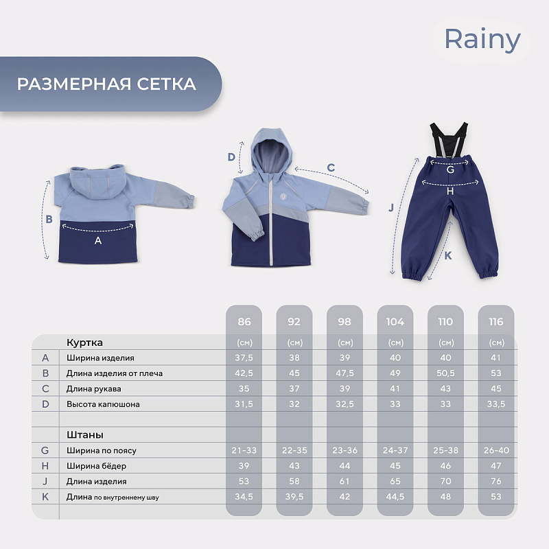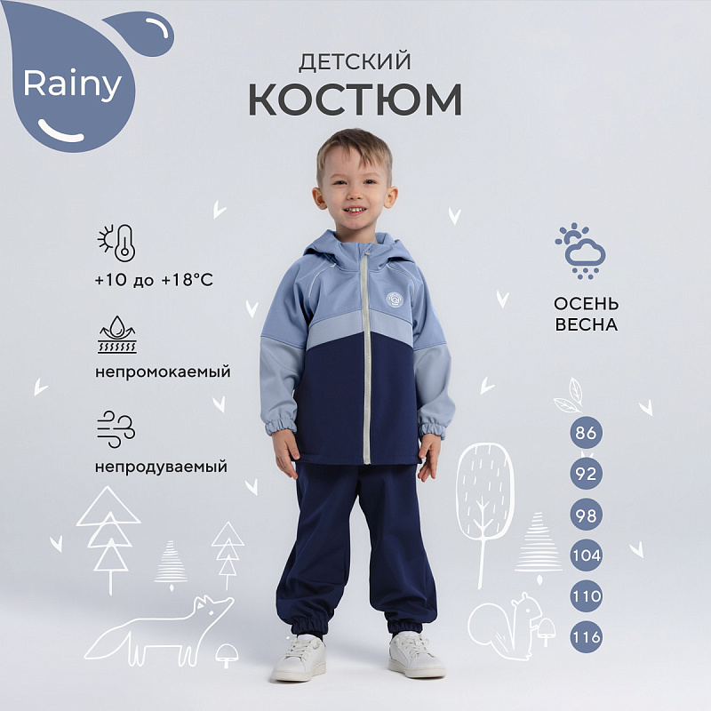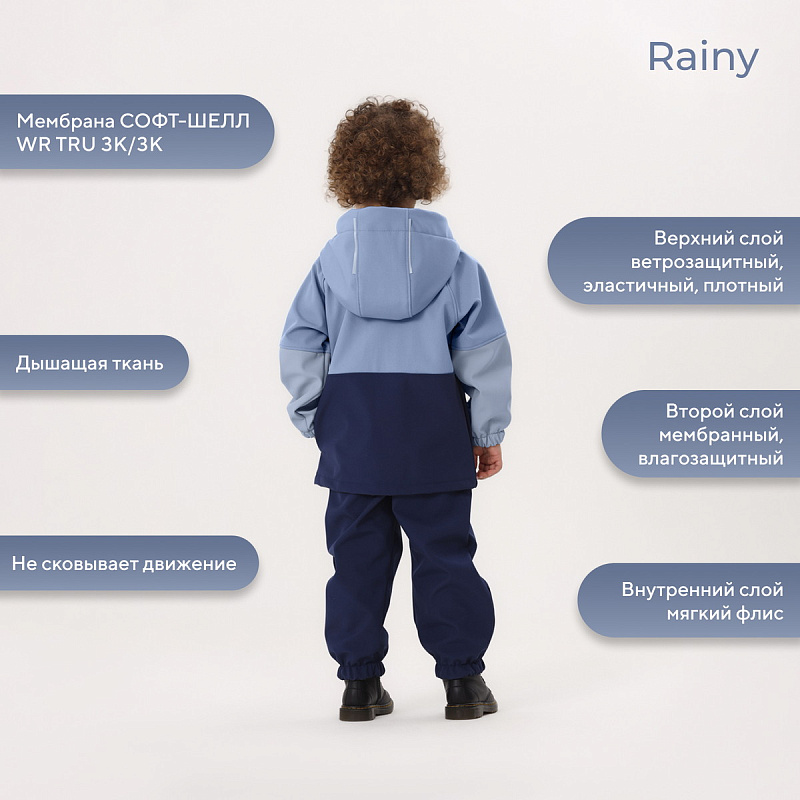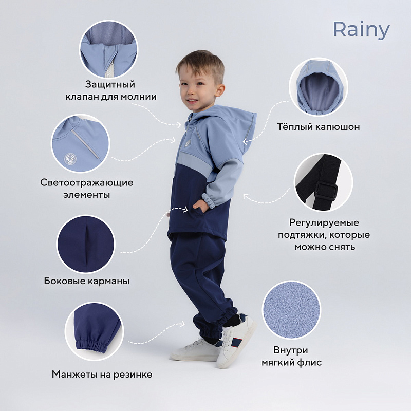 Какое детство без прогулок по лужам? Детский демисезонный костюм RANT RAINY подарит малышу невероятное ощущение уюта и тепла. Модель покорит вас: инновационным влагоотталкивающим и ветронепроницаемым материалом софтшелл, тщательно продуманными деталями кроя, лаконичным исполнением, комфортным лекалом.