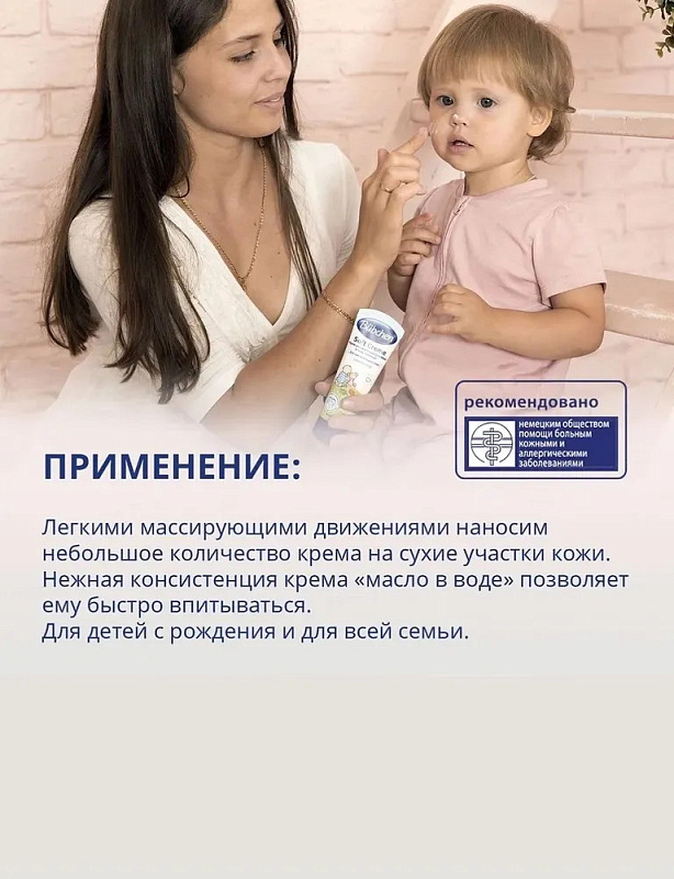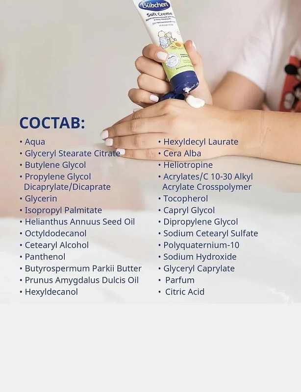 Увлажняющий крем Bubchen "Нежный" имеет легкую консистенцию крема "масло в воде", которая позволяет ему мгновенно впитываться кожей и оставлять приятное ощущение. Чистые растительные масла и увлажняющие ингредиенты крема для лица и тела ухаживают за нежной кожей и защищают ее от пересыхания. Масло подсолнечника поддерживает естественный защитный барьер кожи, а масло карите делает ее нежной и эластичной. Пантенол, гелиотропин и витамин Е - увлажняют и препятствуют возникновению раздражения. Без добавления минерального масла, консервантов и красителей. Крем Бюбхен предназначен для увлажнения нормальной и сухой кожи. Для детей с рождения и для всей семьи. Способ применения: Легкими массирующими движениями нанести небольшое количество крема тонким слоем на сухие участки кожи. Дать крему впитаться. Подходит для ежедневного применения.