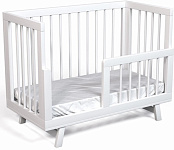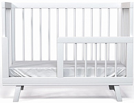 Удобство использования обеспечивают четыре комфортных положения ложа по высоте, продольный маятник в качестве дополнительной опции и сменный защитный бортик, который позволит подросшему малышу самостоятельно залезать в кроватку.