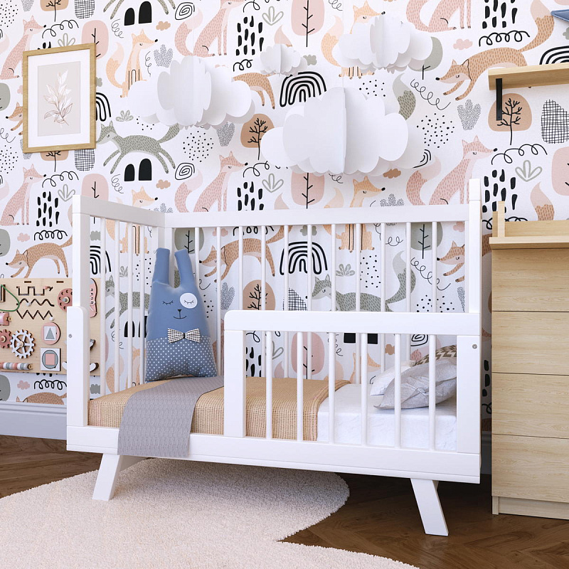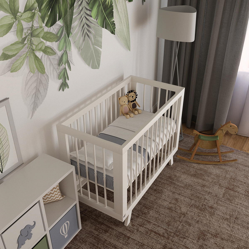 За безопасность ребенка отвечают натуральные материалы, более массивный и потому устойчивый каркас кроватки и стенки из надежных круглых реек, идеальных для захвата детскими ручками.