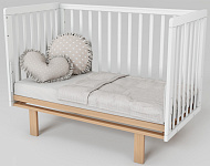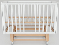 Основание кроватки представляет собой ортопедическую конструкцию из деревянных реек, обеспечивающую правильное развитие позвоночника ребенка и необходимую вентиляцию матраса. Четыре колеса, два из которых оснащены стопорами, позволяют легко перемещать кроватку по комнате и надежно фиксировать ее в выбранном месте.