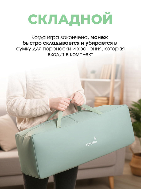 Когда игра закончена, манеж быстро складывается и убирается в сумку для переноски и хранения, которая входит в комплект.