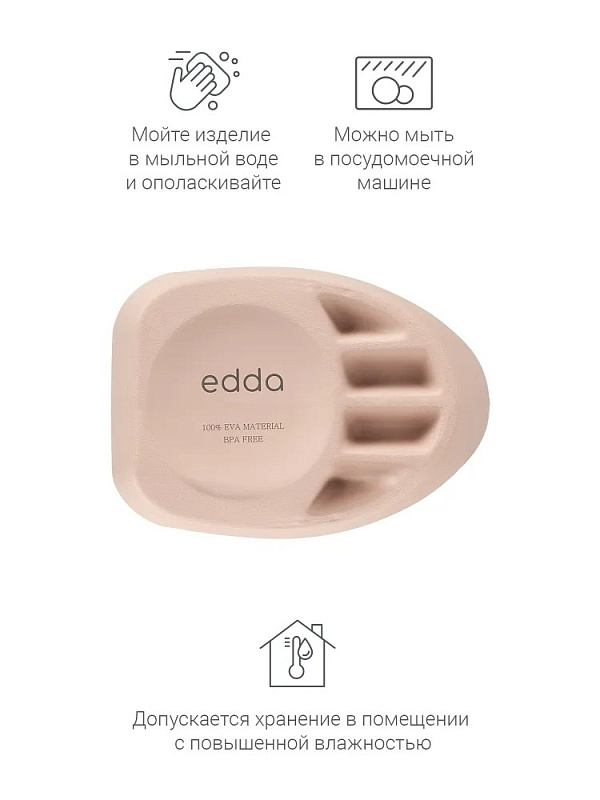 Кувшин для первых водных процедур новорождённого. Объём кувшина edda — 1 литр, он оптимален для купания младенца. Лёгкий кувшин комфортно держать одной рукой, даже когда он наполнен. Гибкий и мягкий, кувшин остаётся бесшумным при падении. Он выполнен из гигиеничного EVA-материала, устойчивого к образованию плесени при высокой влажности. Гипоаллергенность, мягкость материала и обтекаемая форма без острых углов делают кувшин безопасным для новорождённых.