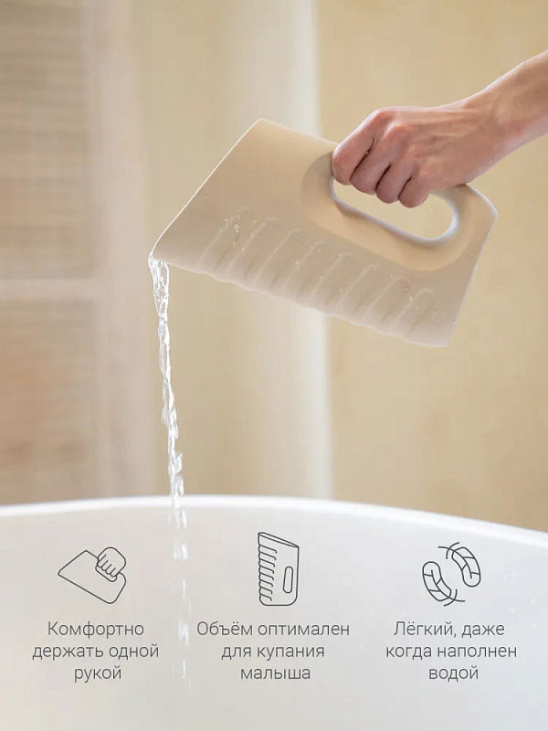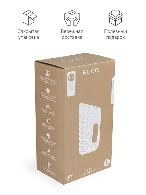 Кувшин для первых водных процедур новорождённого. Объём кувшина edda — 1 литр, он оптимален для купания младенца. Лёгкий кувшин комфортно держать одной рукой, даже когда он наполнен. Гибкий и мягкий, кувшин остаётся бесшумным при падении. Он выполнен из гигиеничного EVA-материала, устойчивого к образованию плесени при высокой влажности. Гипоаллергенность, мягкость материала и обтекаемая форма без острых углов делают кувшин безопасным для новорождённых.