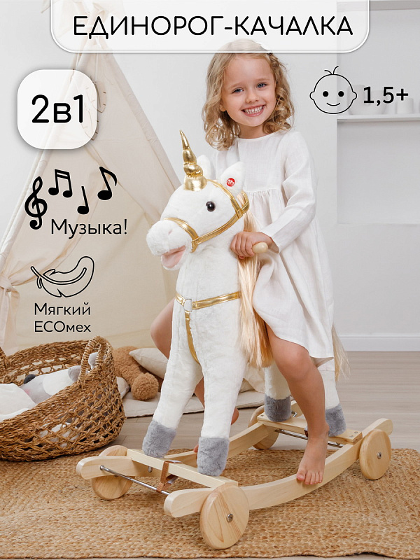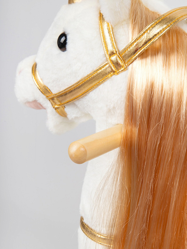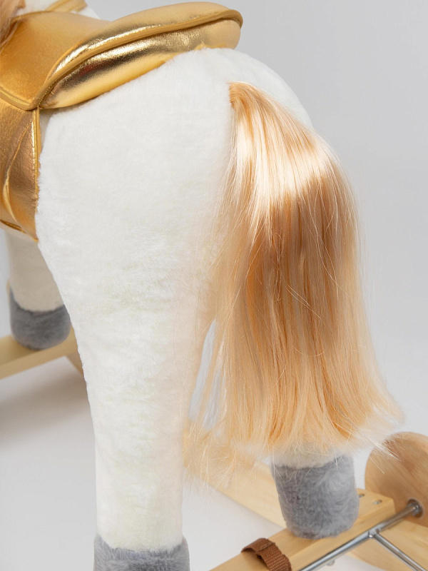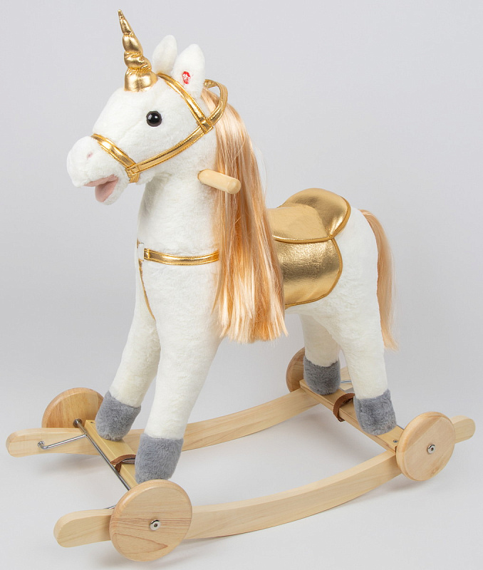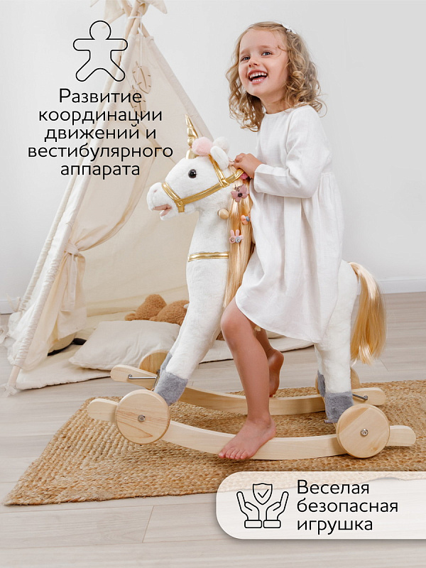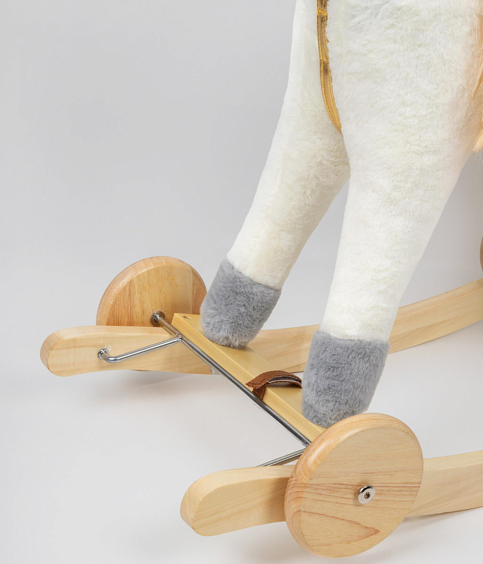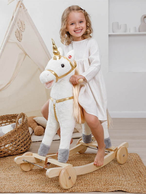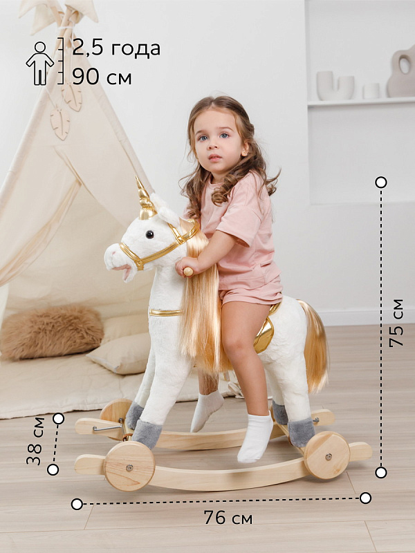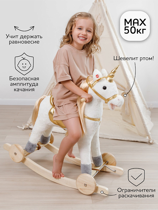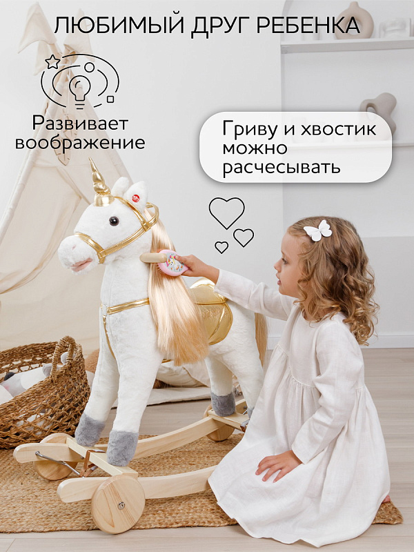 Шерстку и гриву можно расчесывать, заплетать, позволяя ребенку проявлять воображение. Мех легко можно очистить щеткой. Ребенок с удовольствием сможет самостоятельно ухаживать за своим новым другом. Музыкальная детская качалка поет песню при нажатии на ушко, а также умеет открывать рот.