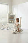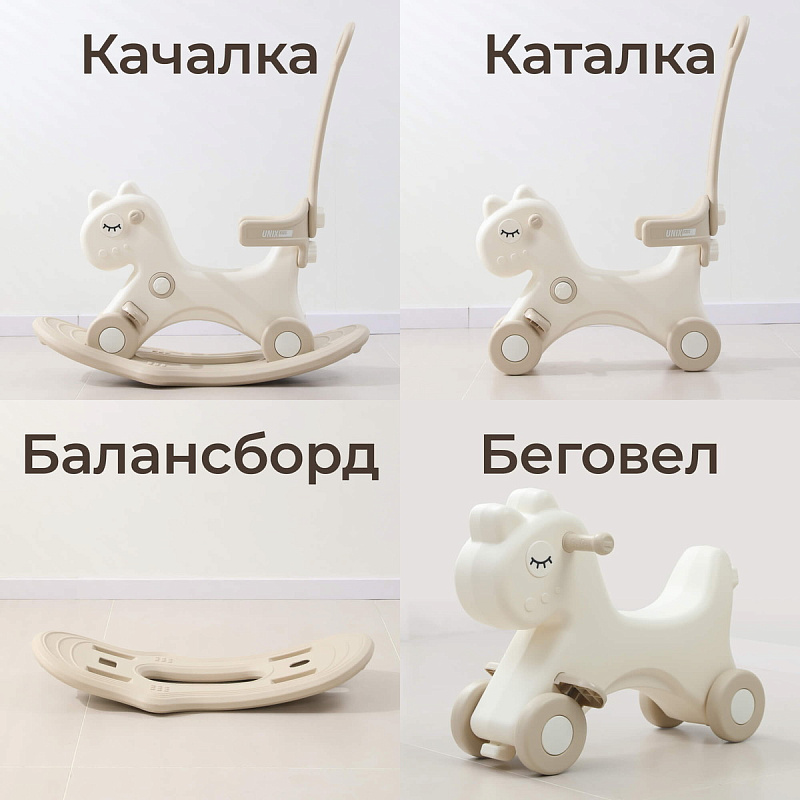 Объединяет сразу четыре вида развлечений для малышей: удобный балансборд, качалку, каталку и беговел.