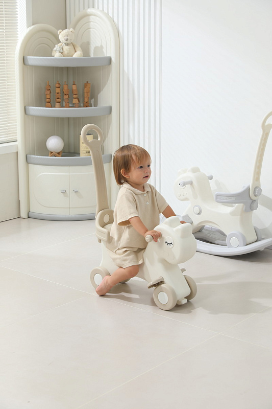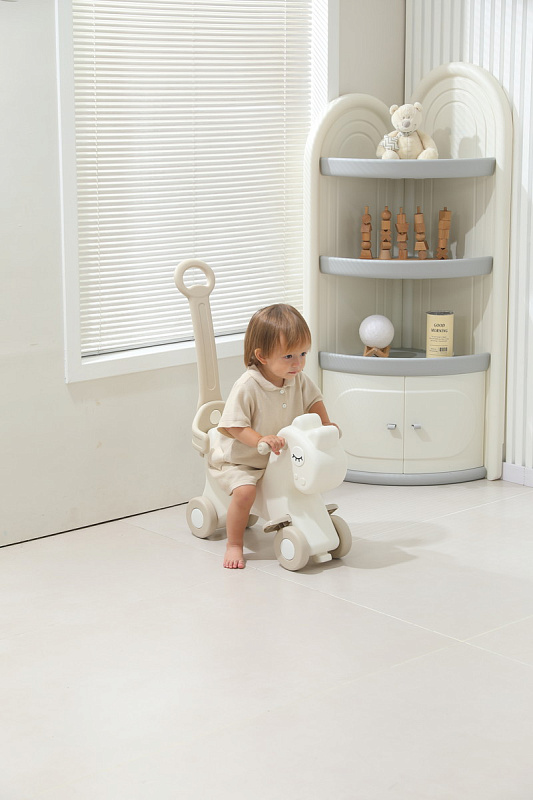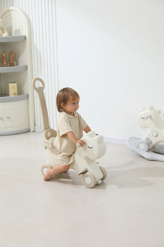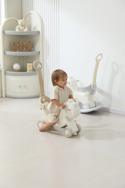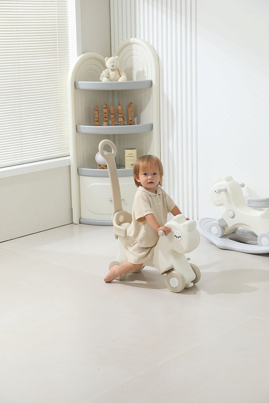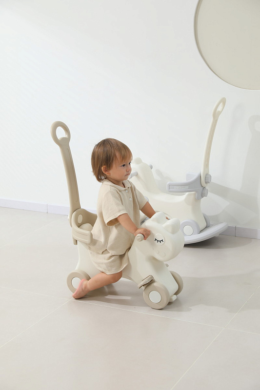 Объединяет сразу четыре вида развлечений для малышей: удобный балансборд, качалку, каталку и беговел.