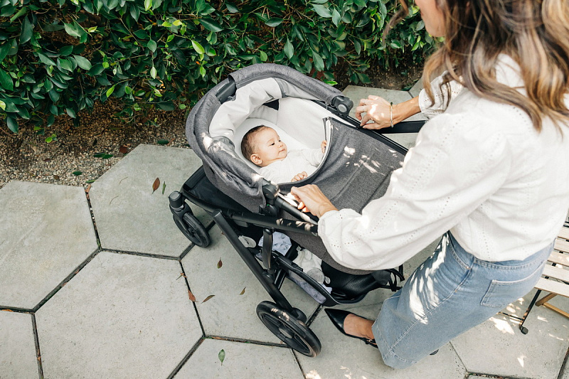 - Защита от солнца: Капюшон оснащен выдвижным козырьком с вентиляционными вставками, который обеспечивает надежную защиту от солнца и ультрафиолета UPF 50+, ветра и других неблагоприятных погодных условий.