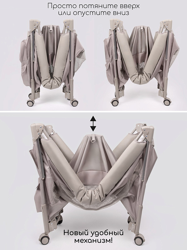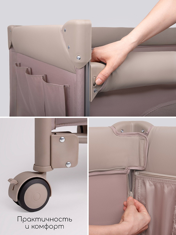 Вся кроватка легко перемещается по дому благодаря четырем прорезиненным поворотным колесам, которые вращаются на 360 градусов и не оставляют следов на полу, причем каждое колесо оснащено надежным фиксатором. Бортик манежа обтянут экокожей, что не только придает ему элегантный внешний вид, но и обеспечивает легкий. В комплекте предусмотрен матрасик, удобная сумка-переноска и фиксирующий ремень.
