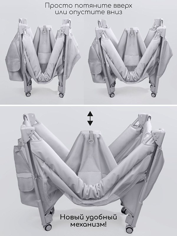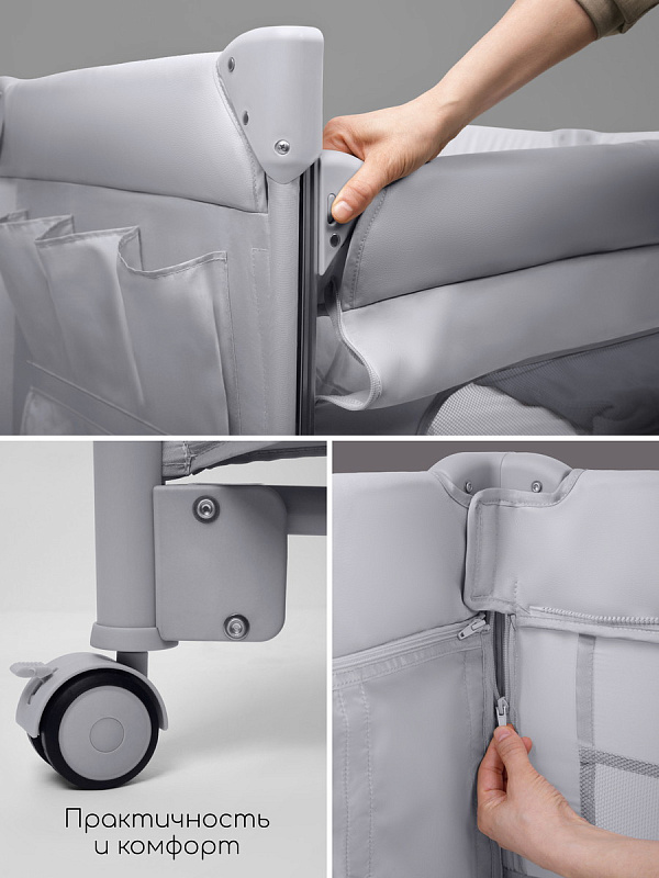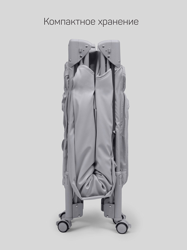 Вся кроватка легко перемещается по дому благодаря четырем прорезиненным поворотным колесам, которые вращаются на 360 градусов и не оставляют следов на полу, причем каждое колесо оснащено надежным фиксатором. Бортик манежа обтянут экокожей, что не только придает ему элегантный внешний вид, но и обеспечивает легкий. В комплекте предусмотрен матрасик, удобная сумка-переноска и фиксирующий ремень.