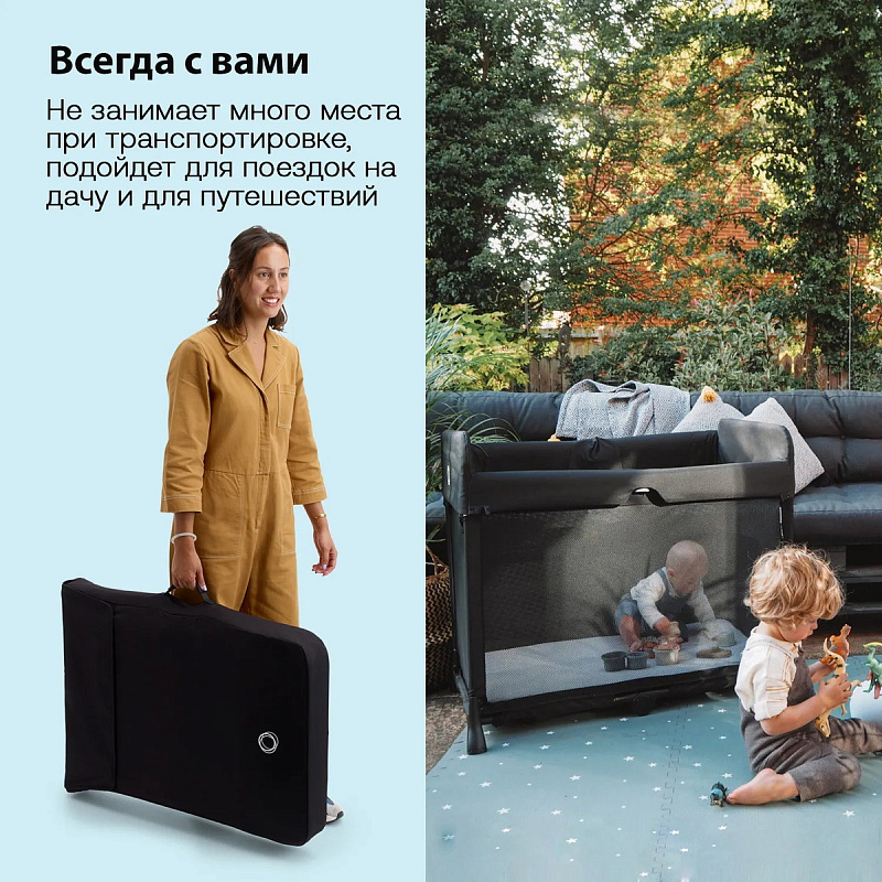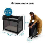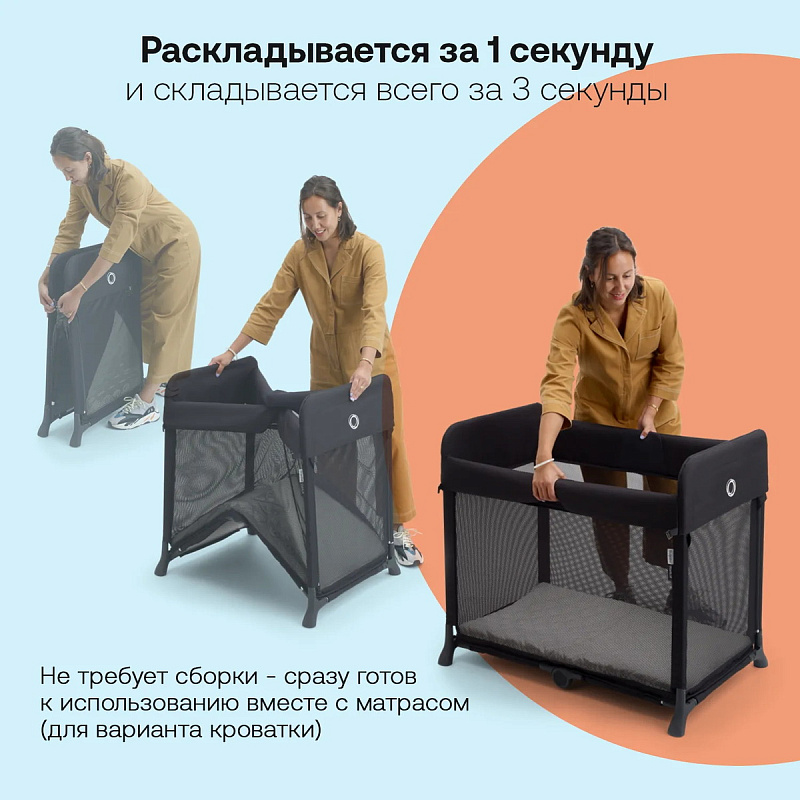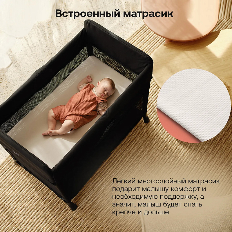 Манеж-кроватка легко раскладывается всего за 1 секунду: пара движений — и все готово для сна или игр малыша, а вы можете вернуться к своим делам.