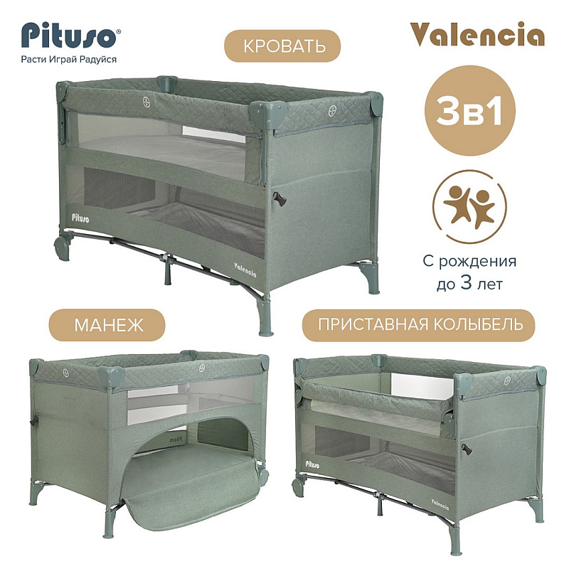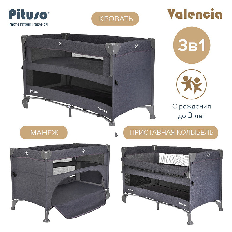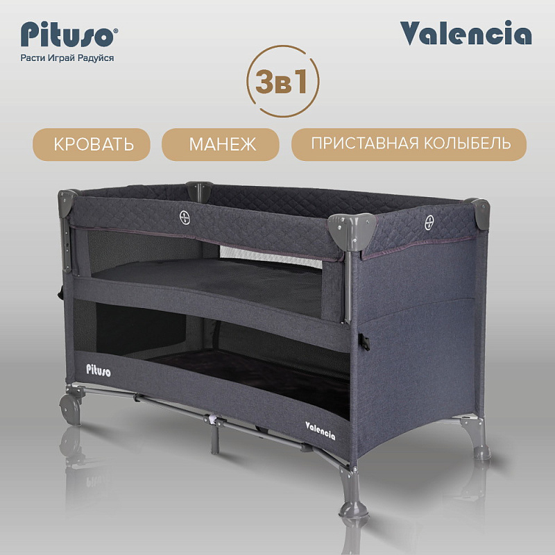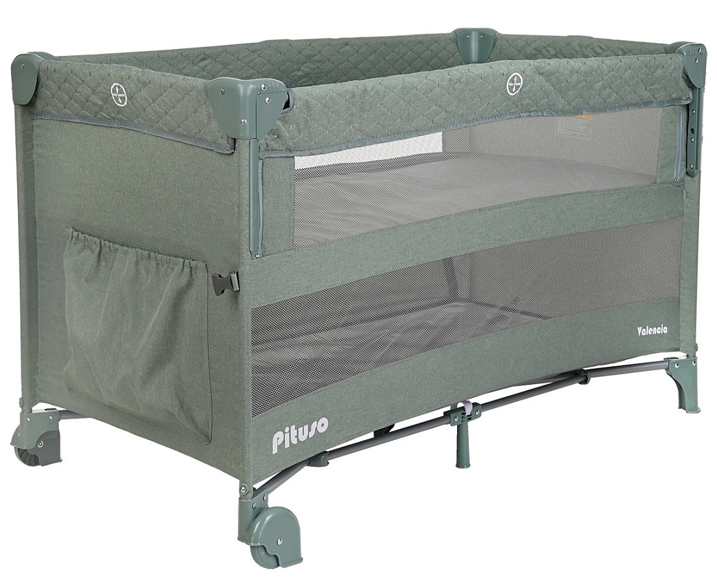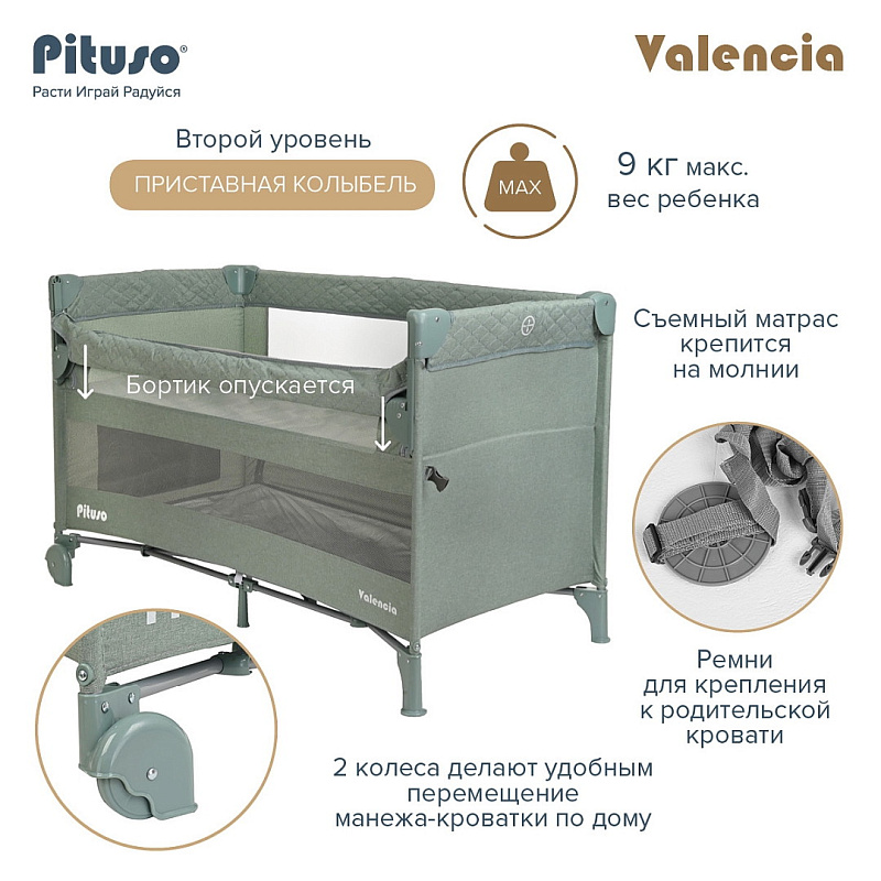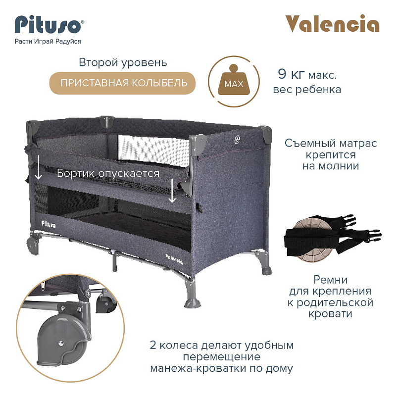 Двухуровневый манеж Pituso VALENCIA с функцией приставной колыбели создает безопасное, удобное и комфортное пространство, где ребенок может отдыхать и весело играть вместе с любимыми игрушками. Благодаря второму уровню манеж можно использовать вместо кроватки с самого рождения малыша. Манеж можно установить рядом с кроватью родителей и благодаря опускающемуся бортику использовать как приставную кровать. Кроватка надежно крепится к родительской кровати с помощью ремней.