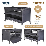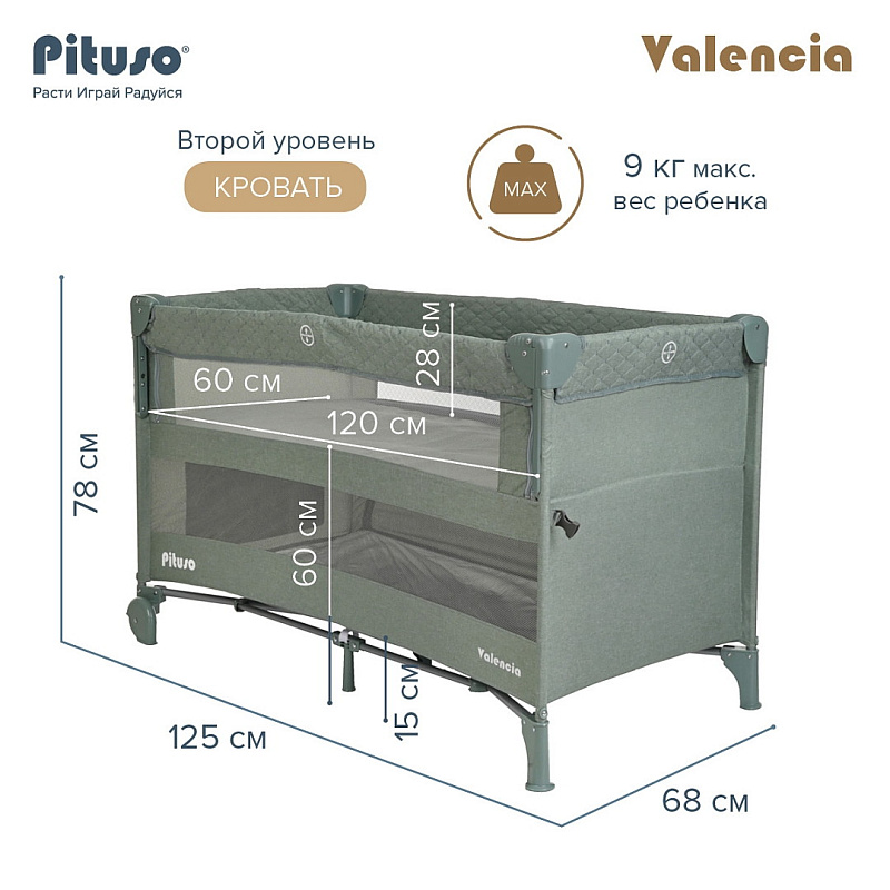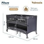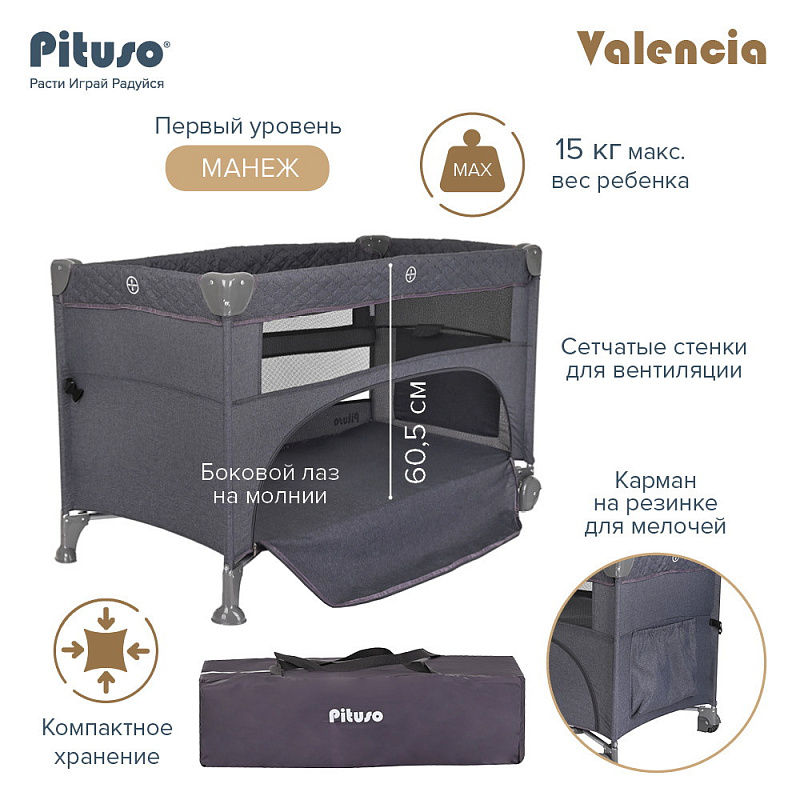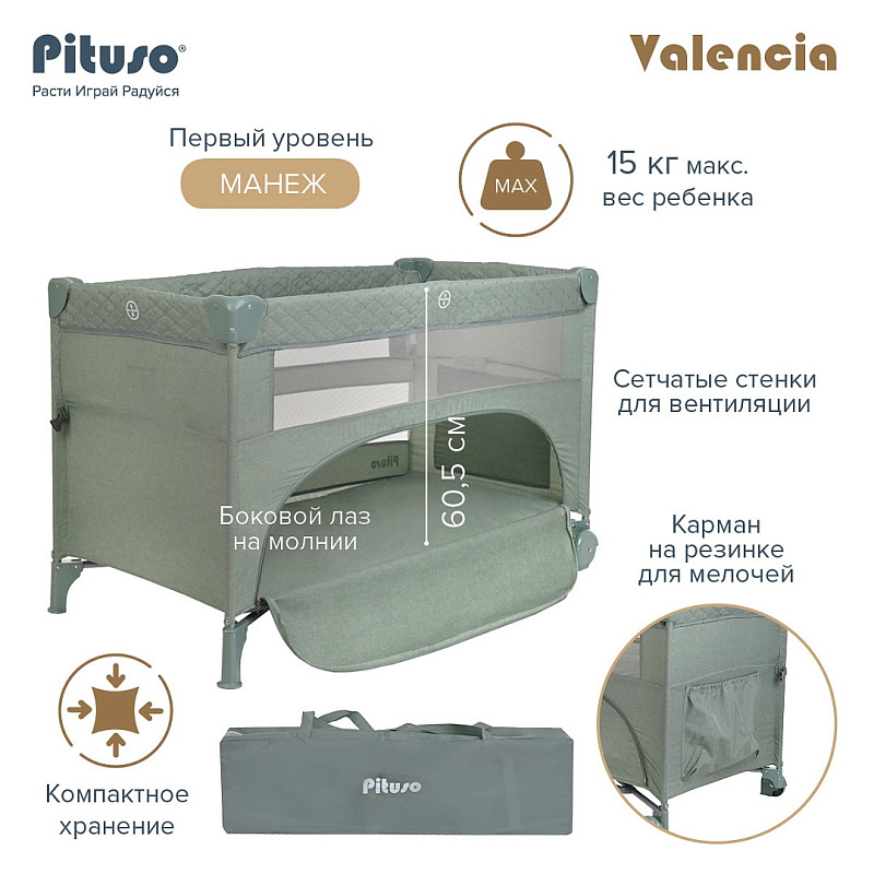 Pituso VALENCIA можно поставить в комнате малыша, также его удобно брать с собой на дачу или для похода в гости. Подходит для младенцев и детей весом до 15 кг для нижнего уровня. Второй уровень в функции кровати подходит для детей не тяжелее 9 кг. Манежем в функции кроватки рекомендуется пользоваться до того момента, пока ребенок не научился вставать и подтягиваться. Манеж кровать оснащен 2 колесами с блокираторами.