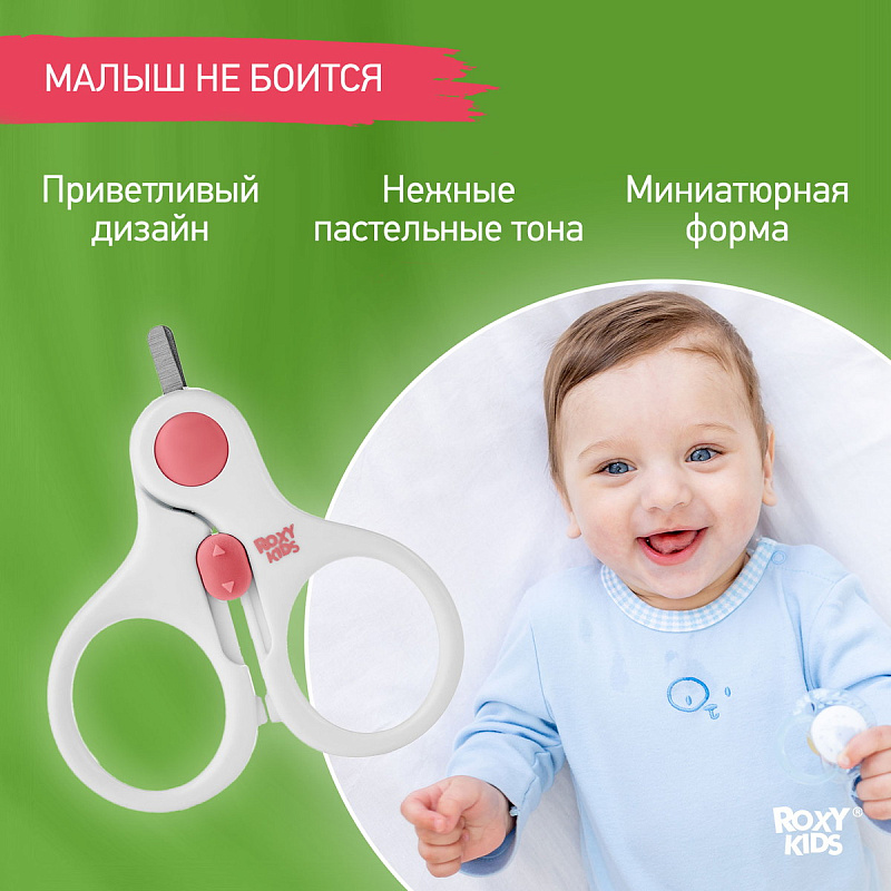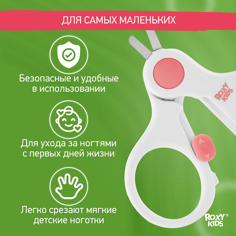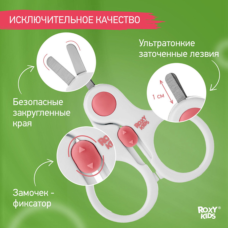 Маникюрные ножницы ROXY-KIDS разработаны для ухода за ногтями новорожденных с первых дней жизни. Ноготки младенцев настолько мягкие, что их могут срезать лишь действительно тонкие лезвия. В производственный процесс ножниц ROXY-KIDS включена дополнительная заточка лезвий, благодаря чему они имеют толщину 0,4 мм. Закругленная форма и небольшой размер лезвий делают ножницы безопасными в работе, а замок на ручках не позволит ребенку открыть их самостоятельно. Удобная форма ручек обеспечивает надежный захват. Подстригайте ноготки, когда они отрастают на 1 мм, иначе малыш может себя поцарапать. Ножницы с короткими закругленными лезвиями позволят вам аккуратно, быстро и безболезненно подрезать ноготки новорожденного. Маникюрные ножницы ROXY-KIDS изготовлены из нержавеющей стали с применением новейших технологий производства.