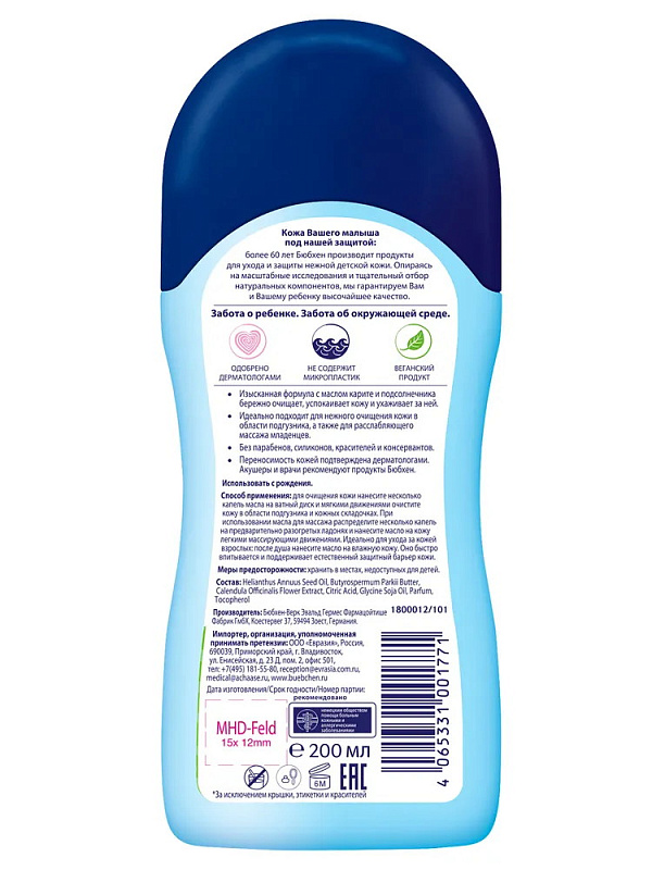 Формула с маслом карите и подсолнечника нежно очищает и успокаивает кожу, обеспечивая ей мягкий уход. Масло для младенцев оптимально подходит для бережного очищения кожи в области подгузника и для приятного массажа. Акушеры и врачи рекомендуют Бюбхен.Жирные кислоты растительных масел (омега 3, омега 6 и др.) питают кожу и убирают покраснения.