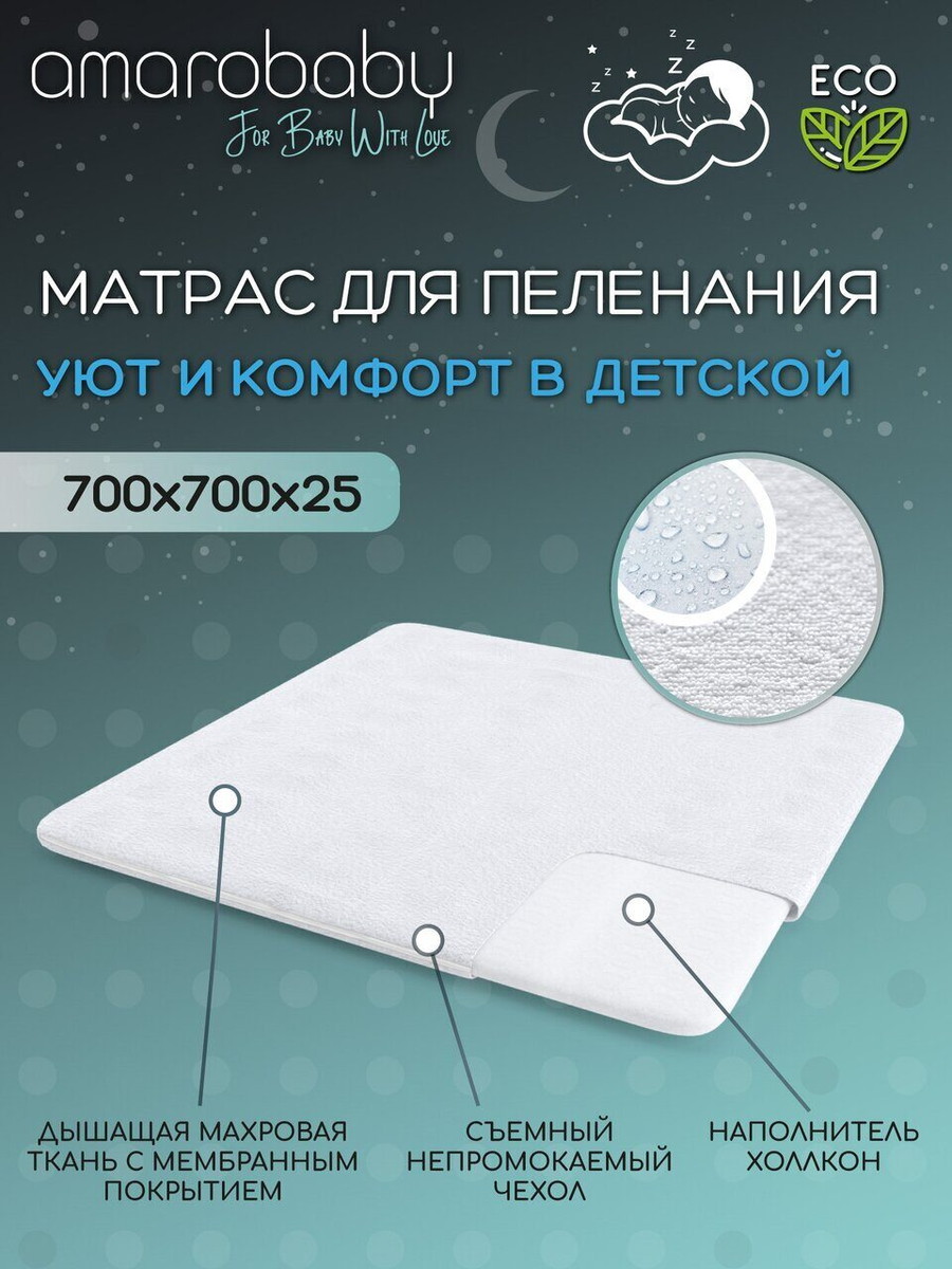 Матрас для пеленания AmaroBaby незаменимый помощник любой мамы! Матрас можно положить на пеленальный комод, брать с собой в поездки и использовать во время гимнастики и во время совместного сна, чтобы кроха не испачкал взрослую кровать. Матрас будет эффективен для защиты любой поверхности от загрязнений и протеканий. Съемный чехол матраса полностью непромокаемый. Съемный чехол из мягкой и нежной махровой хлопковой ткани. Изделие соответствует Российским стандартам качества. Съемный чехол имеет водонепроницаемую дышашую мембрану, хорошо пропускающую воздух, позволяя материалу «дышать», но не пропускающую воду.