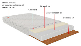 Основой матраса Vikalex Палермо 120х60х12 см является 8-ми сантиметровый слой холлофайбера. С одной из сторон матраса расположен слой бикокоса (2 см), а с другой слой латекса (2 см) и спанбонда - тонкого нетканого материала, изготовленного из полипропиленового волокна по технологии термоскрепления.
