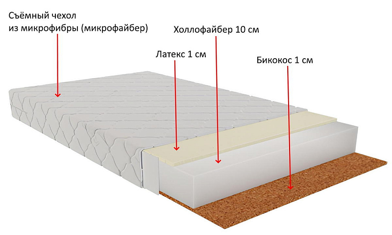 Основой матраса является 10-сантиметровый слой холлофайбера - современного материала, являющимся улучшенной версией поролона. Холлофайбер более эластичен, долговечен, экологичен.