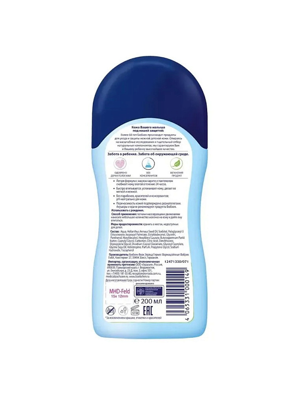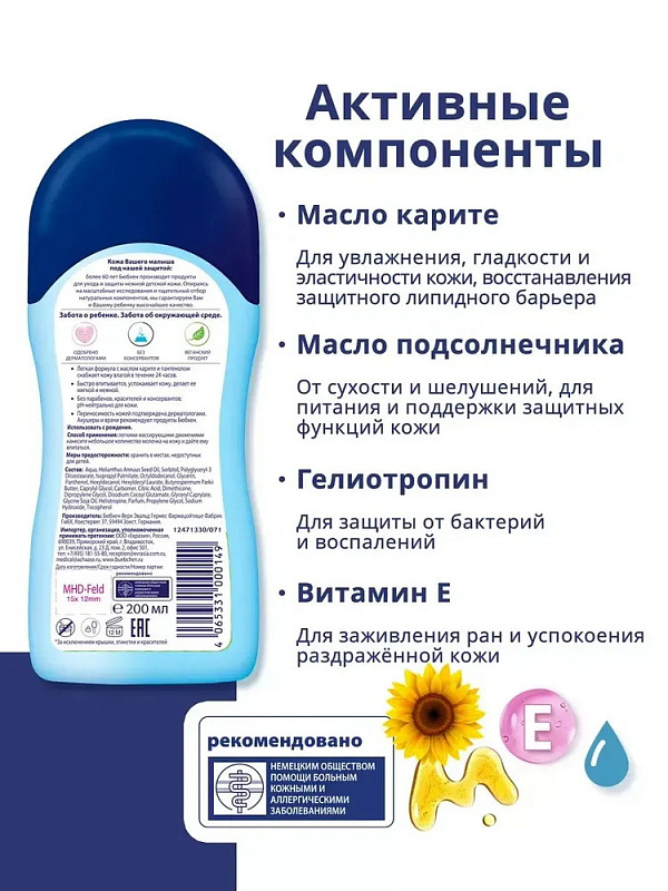 Легкая формула с маслом карите и пантенолом снабжает нежную детскую кожу влагой в течение 24 часов. Молочко быстро впитывается, успокаивает кожу и делает ее мягкой и эластичной.