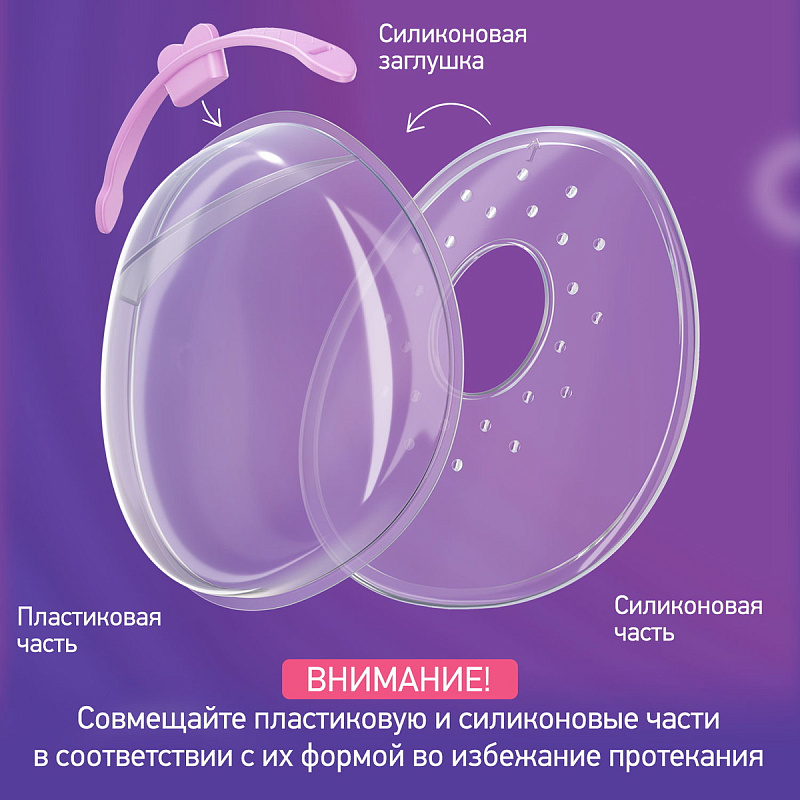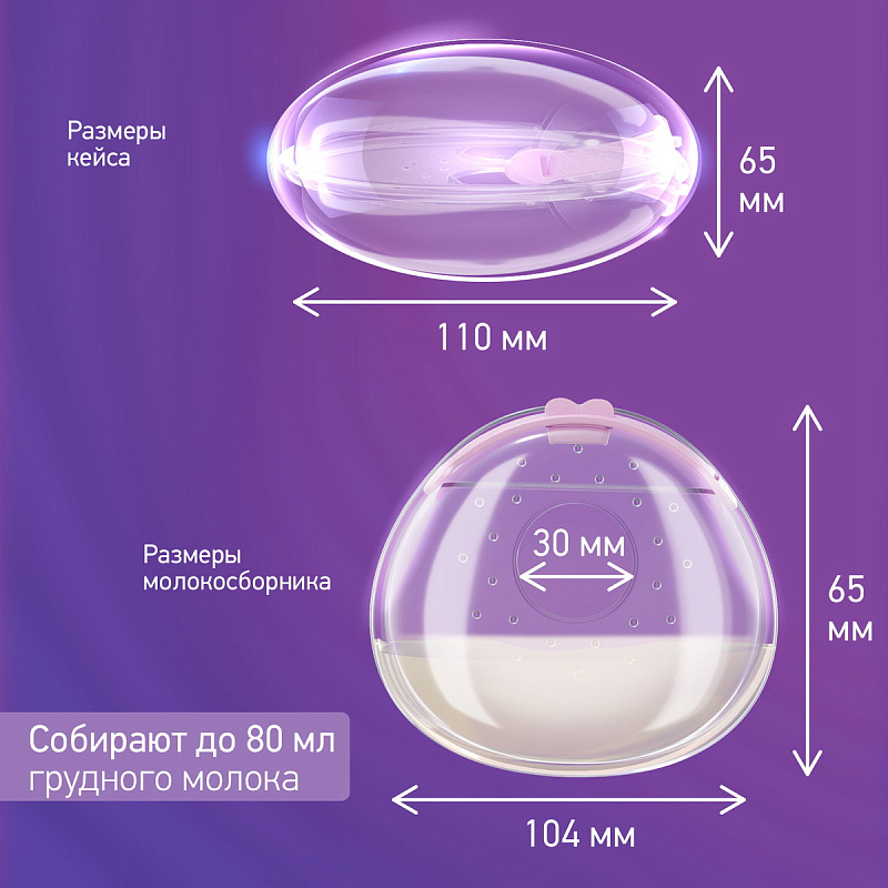 Молокосборник – это незаменимый аксессуар для кормящих мам, который предназначен для сбора грудного молока на протяжении всего периода лактации. Молокосборники позволяют избежать протекания грудного молока на одежду, сохраняют материнское молоко и способствуют заживлению поврежденных сосков. Они изготовлены из гипоаллергенного материала, не содержат вредных веществ и абсолютно безопасны для здоровья мамы и малыша. Силиконовая заглушка надежно закрывает отверстие для переливания молока во время использования молокосборников и исключает протекание. Молокосборники надежно прилегают и незаметны под одеждой, благодаря мягкой силиконовой части они не вызывают дискомфорта и подходят для ежедневного использования. В комплект входит 2 накладки по 40 мл и пластиковый футляр для гигиеничного хранения, который удобно брать с собой в дорогу. Молокосборник прост в использовании: поместите молокосборник под нижнее белье или спортивный топ и прижмите к груди. После заполнения перелейте молоко в подходящий сосуд через отверстие сверху и используйте повторно при необходимости. Носите обе накладки в промежутках между кормлением грудью. Используйте одну накладку на свободной груди для сохранения молока во время кормления. Перед применением стерилизуйте молокосборник с помощью стерилизатора, СВЧ или кипячения. Совмещайте пластиковую и силиконовые части в соответствии с их формой во избежание протекания.