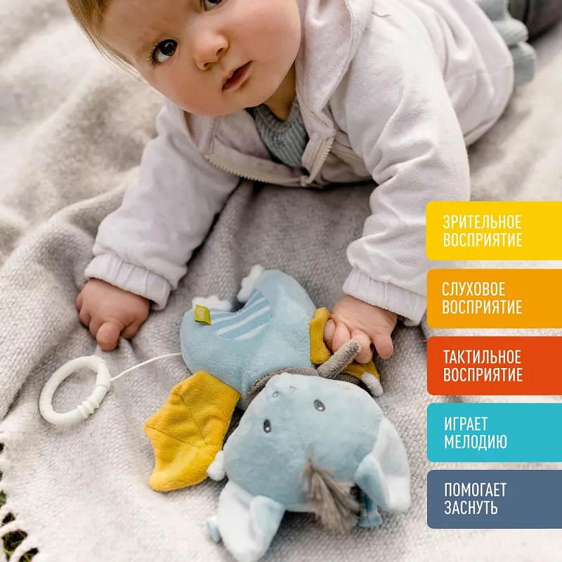 Плюшевая мышка очень приятная на ощупь – с ней здорово обниматься и играть. Музыка включается, если потянуть за колечко. Игрушка развивает хватательные навыки, тактильное восприятие, зрение и слух ребенка.
