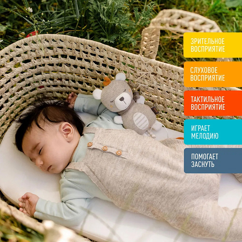 Музыкальная игрушка для засыпания в виде очаровательного медвежонка, воспроизводящая колыбельную Брамса «Спи, дитя, спи». Приятная громкость расслабляет и убаюкивает маленьких мечтателей. Время воспроизведения около двух минут.